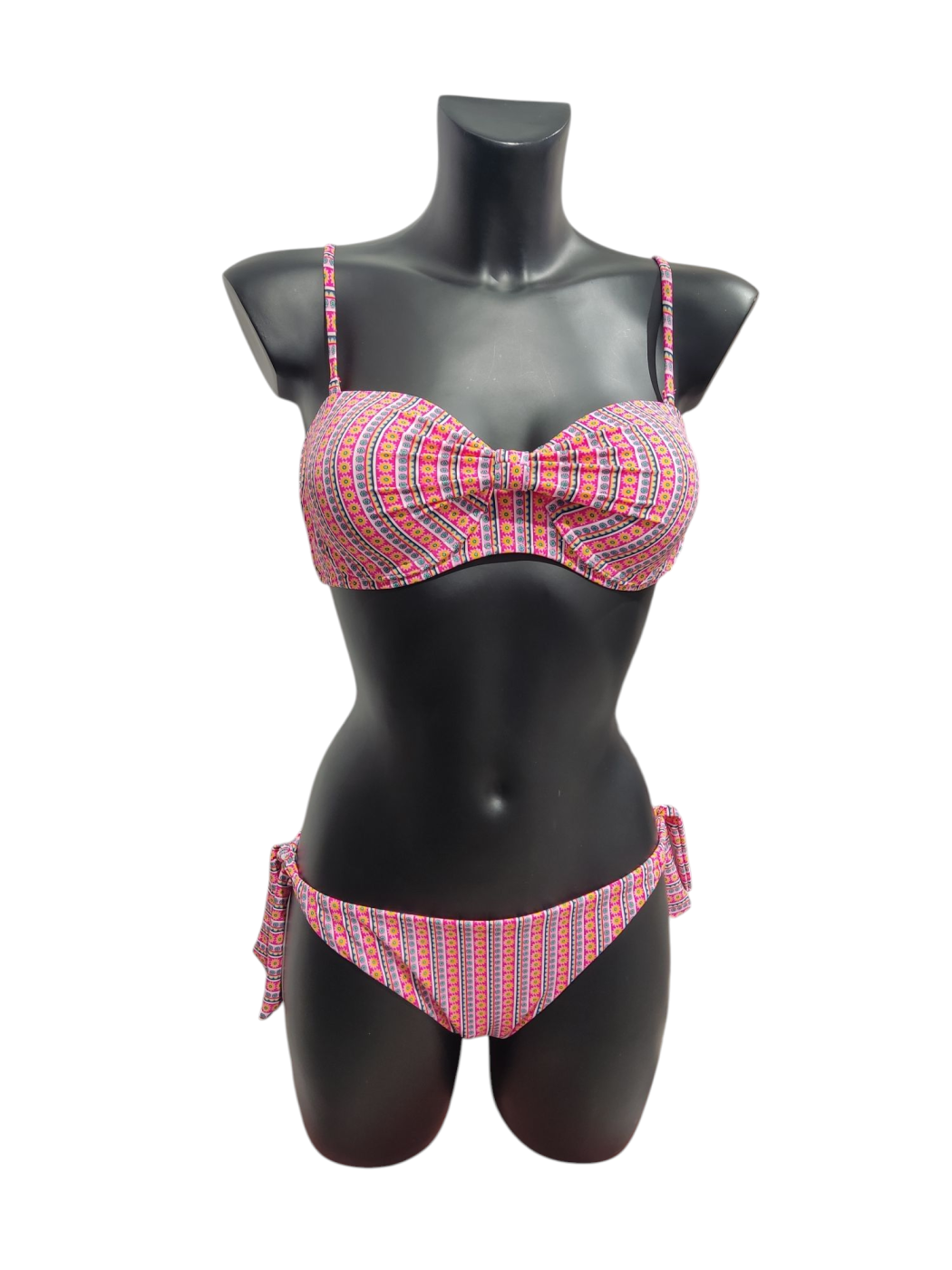 Biquini floral. Sujetador con aros y tiranta extraíble. Braguita con lazada en los laterales. Cuenta con push up a parte.