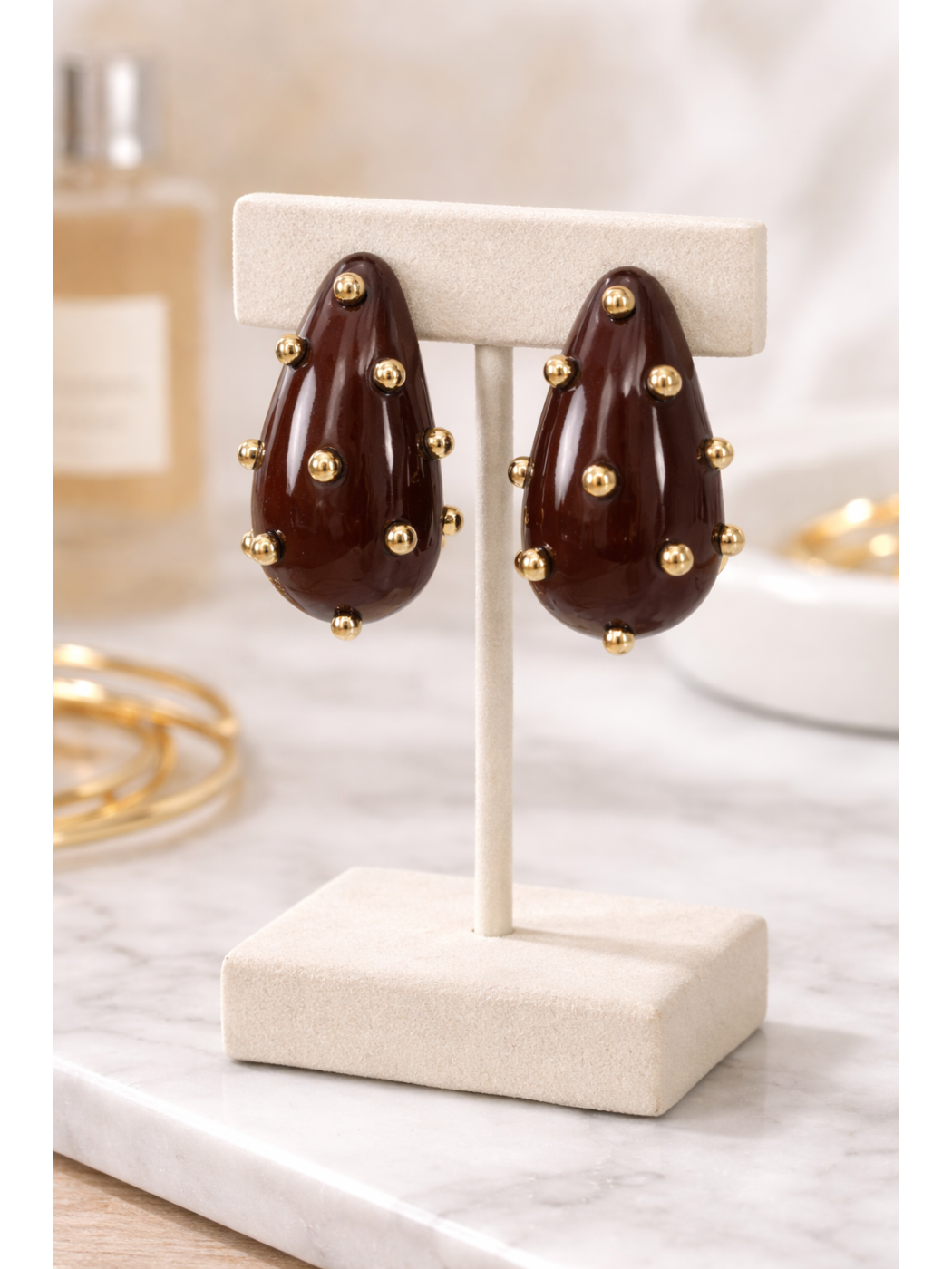 Pendientes Lina. Pendientes en forma de gota. El contraste lo aportan los cabujones dorados incrustados, que añaden relieve, textura y un brillo metálico que eleva la pieza.