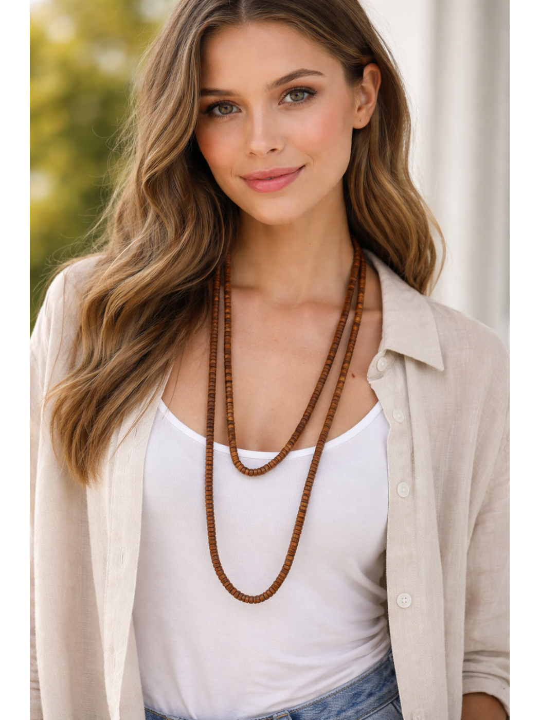 Colgante Babilonia. collar largo de estilo bohemio compuesto por múltiples vueltas de pequeñas cuentas de madera en tonos bronce.