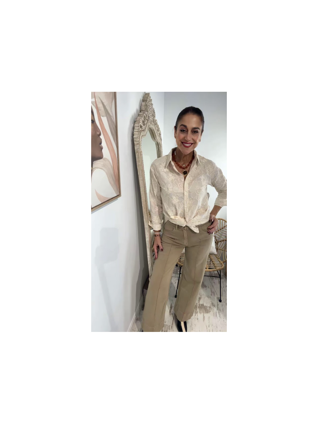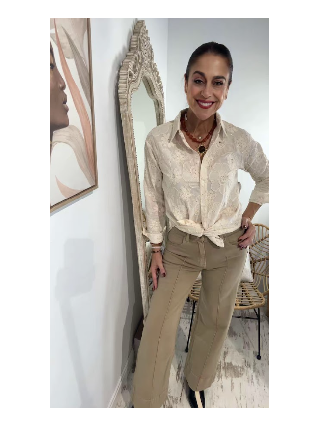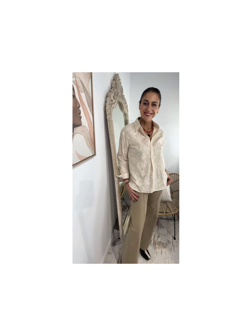 Camisa Lidia. Camisa camisera con cuello solapa. Tejido con diseño bordado y perforado. Pequeños toques de lentejuela dorada.
