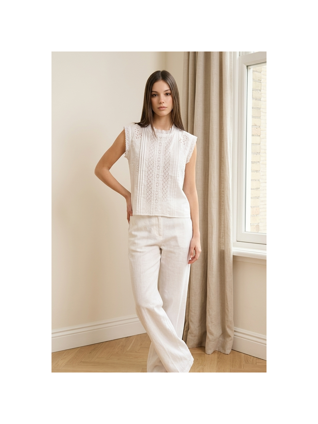Blusa Daniela. Esta blusa es una pieza de estilo romántico y atemporal. Destaca por sus intrincados bordados y aplicaciones de encaje o puntilla en el panel frontal y los hombros. También incorpora pliegues verticales o jaretas que añaden textura y un toque artesanal a la prenda. Presenta un cuello redondo (o de caja) y una silueta sin mangas (manga sisa).