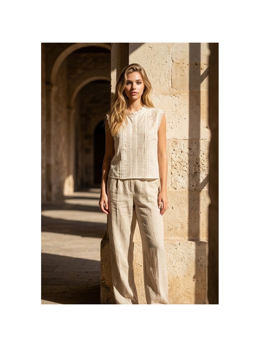 Blusa Daniela. Esta blusa es una pieza de estilo romántico y atemporal. Destaca por sus intrincados bordados y aplicaciones de encaje o puntilla en el panel frontal y los hombros. También incorpora pliegues verticales o jaretas que añaden textura y un toque artesanal a la prenda. Presenta un cuello redondo (o de caja) y una silueta sin mangas (manga sisa).