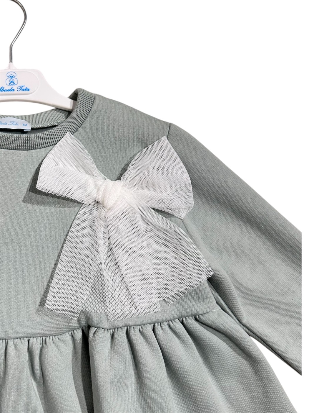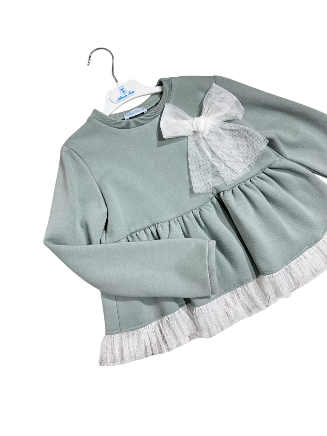 Trajes de Flamenca Mantones de Flamenca Pendientes de Flamenca Flores de Flamenca Broches de Flamenca Peinetas FlamencasJersey Abuela tata Lucia. Jersey de niña de la marca Abuela Tata con un gran lazo blanco de tul en el pecho y un volante de tul blanco en el bajo. Diseño de manga larga, cuello redondo y un bajo con volante fruncido.