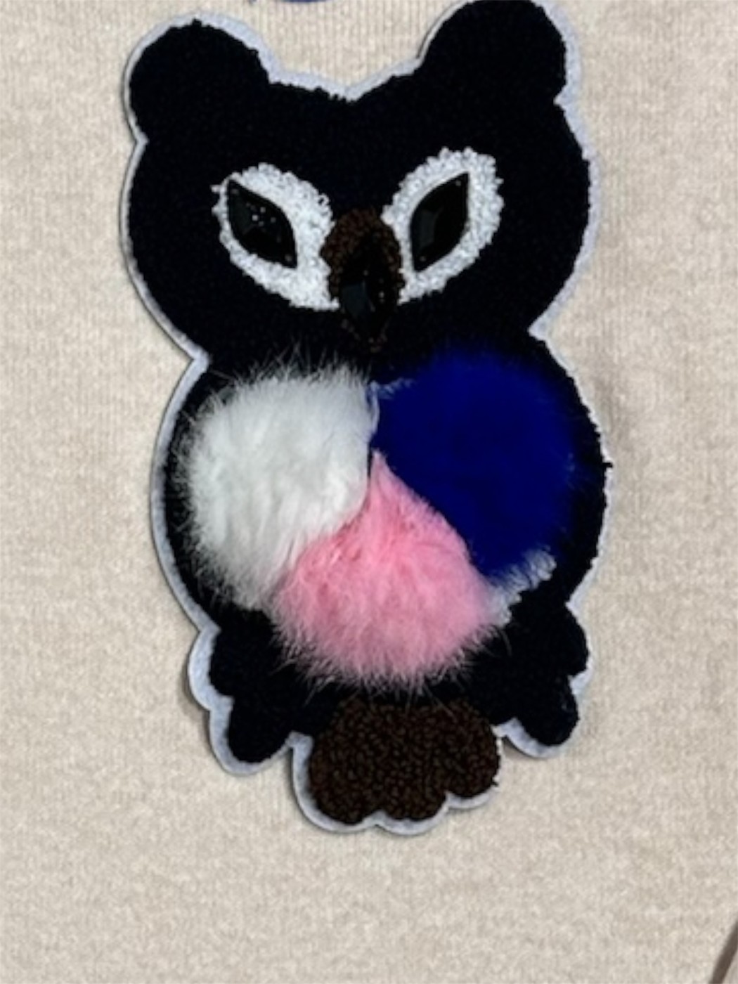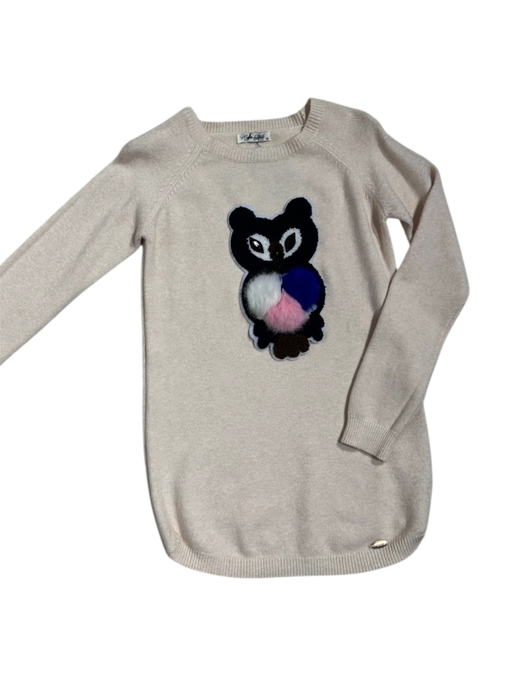 Jersey niña buho. Se trata de un jersey de punto de manga larga en un tono beige claro o avena. El diseño es sencillo, de corte recto y cuello redondo. El elemento más distintivo es el aplique de un búho cosido en el centro del pecho. La cara del búho es de un tejido más oscuro, negro o gris oscuro, mientras que el cuerpo está formado por tres pompones de diferentes colores.
