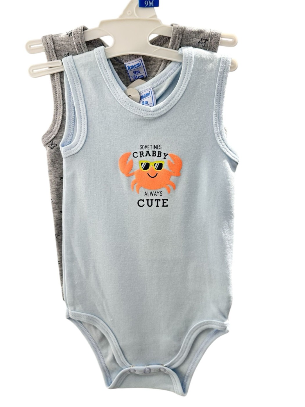 Pack 2 bodys cangrejo. ¡Dos adorables bodies para bebé! Uno en azul cielo con un divertido cangrejo que dice "A veces gruñón, siempre adorable", y otro en gris con timón de barco. ¡Perfectos para mantener a tu pequeño cómodo y con estilo!
