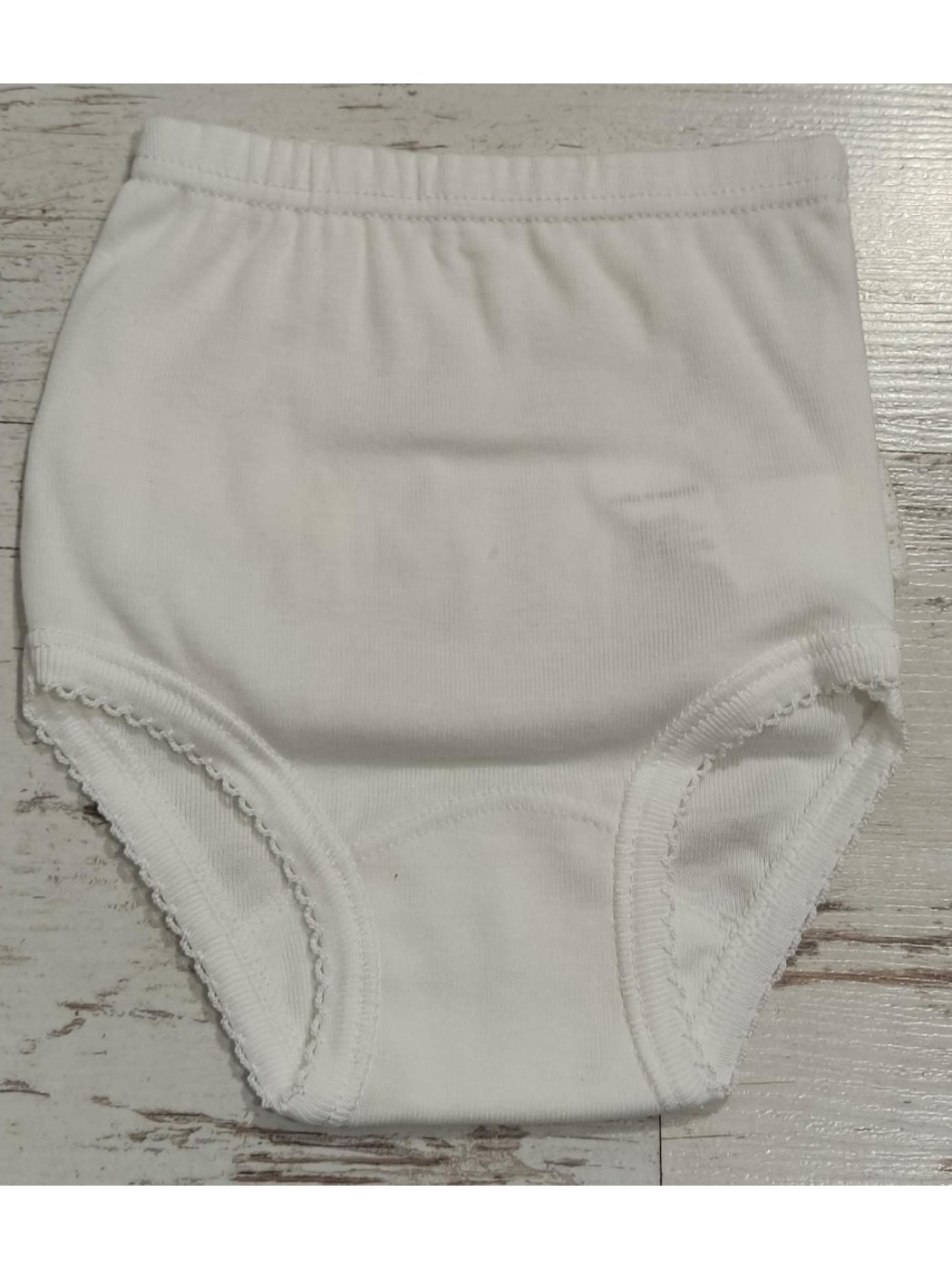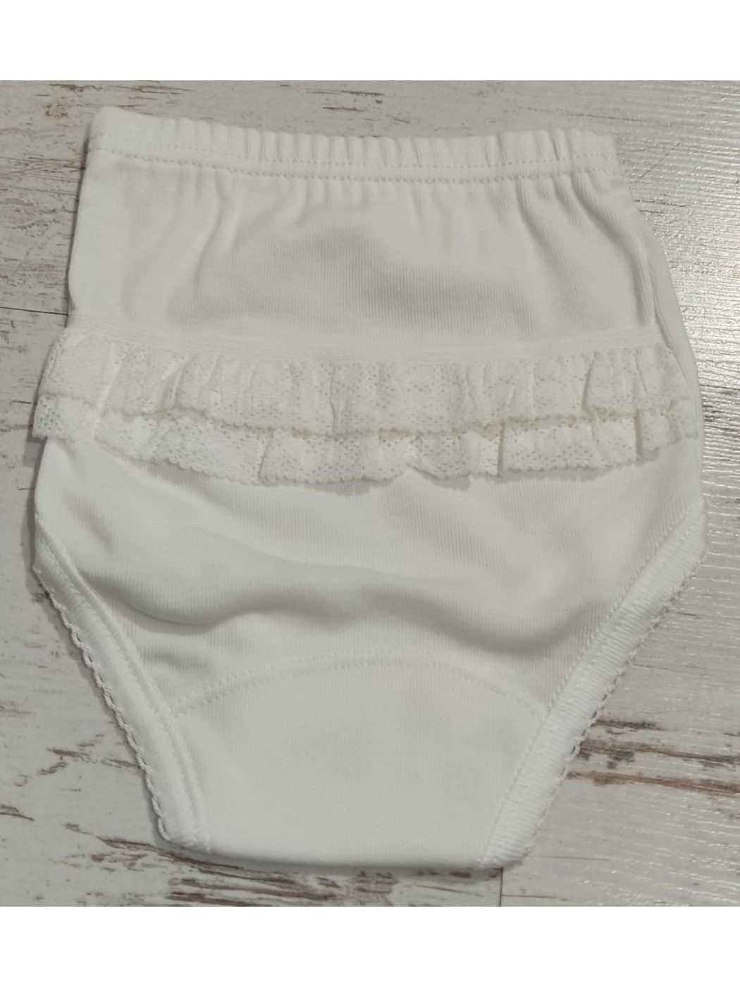 BRAGUITA CUBREPAÑAL DE ALGODON Y CINTURA ENGOMADA. EN LA PARTE TRASERA CUENTA CON DOS VOLANTES FRUNCIDOS Y UNA PEQUEÑA PUNTILLITA AL TONO ALREDEDOR DE LOS HUECOS DE PIERNA.
