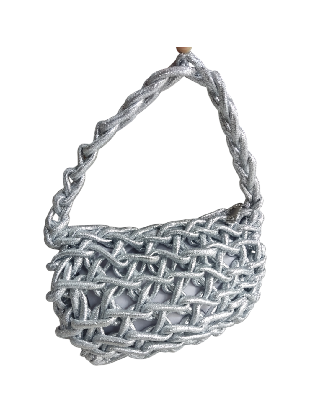 Bolso Amina. Bolso con asa pequeña. Diseño de cuerda metalizada. Cierre de cremallera. Medidas aproximadas de 23x14cm sin contar con asa.