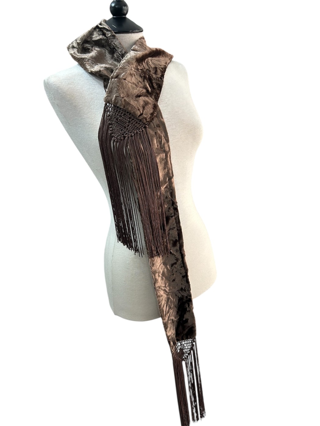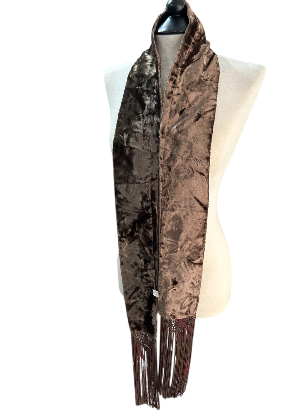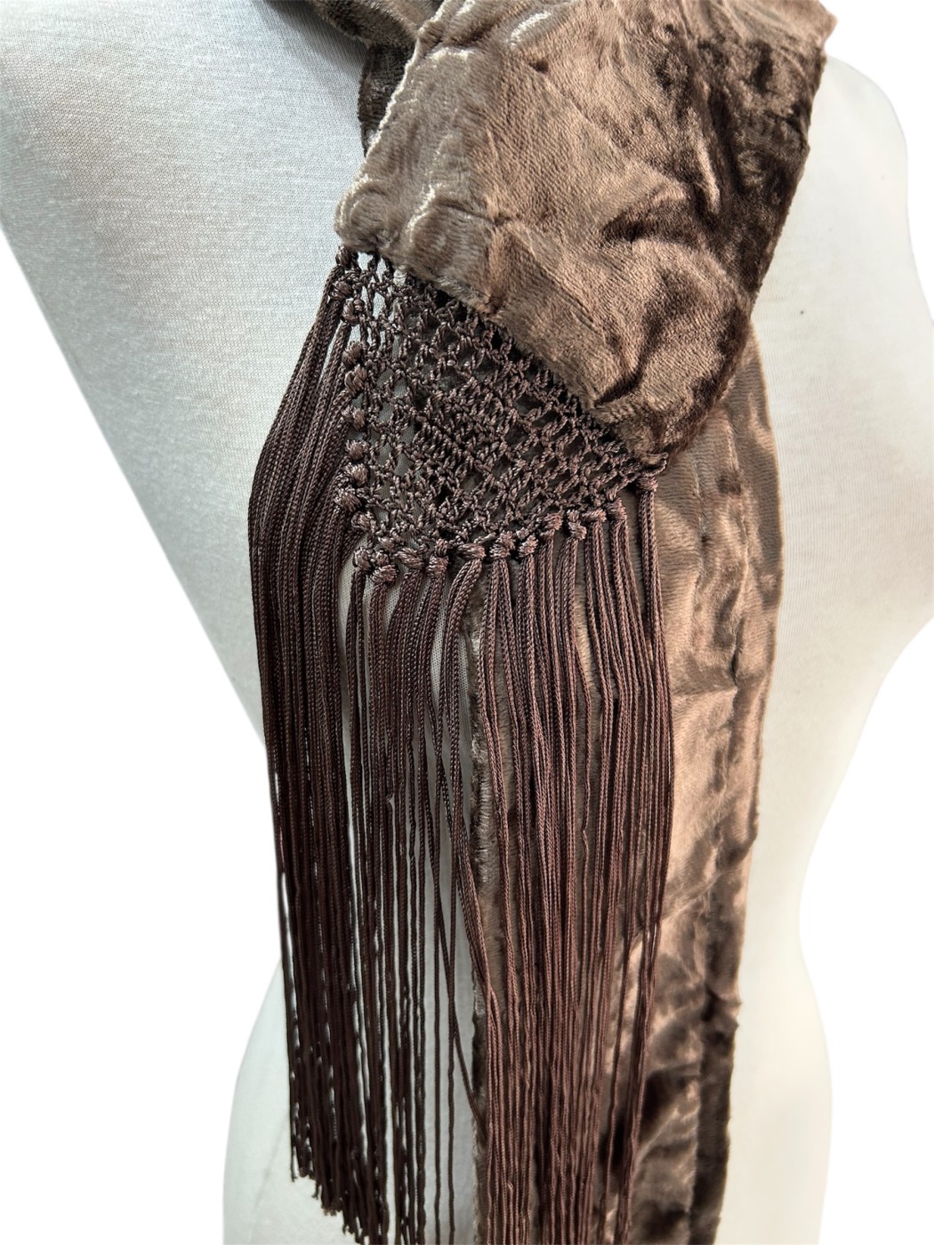 Pañuelo terciopelo Lola. Pañuelo aterciopelado estrecho terminado en preciosos flecos. Un accesorio elegante para terminar de darle un toque sofisticado a tus atuendos.