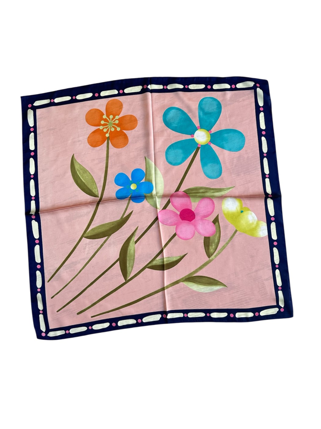 Pañuelo Margarita. Pañuelo de cuello/pelo de estilo fresco y juvenil con estampado floral con margaritas de estilo retro sobre un fondo de color liso y bordes con detalles de puntos. Complemento ideal y original !