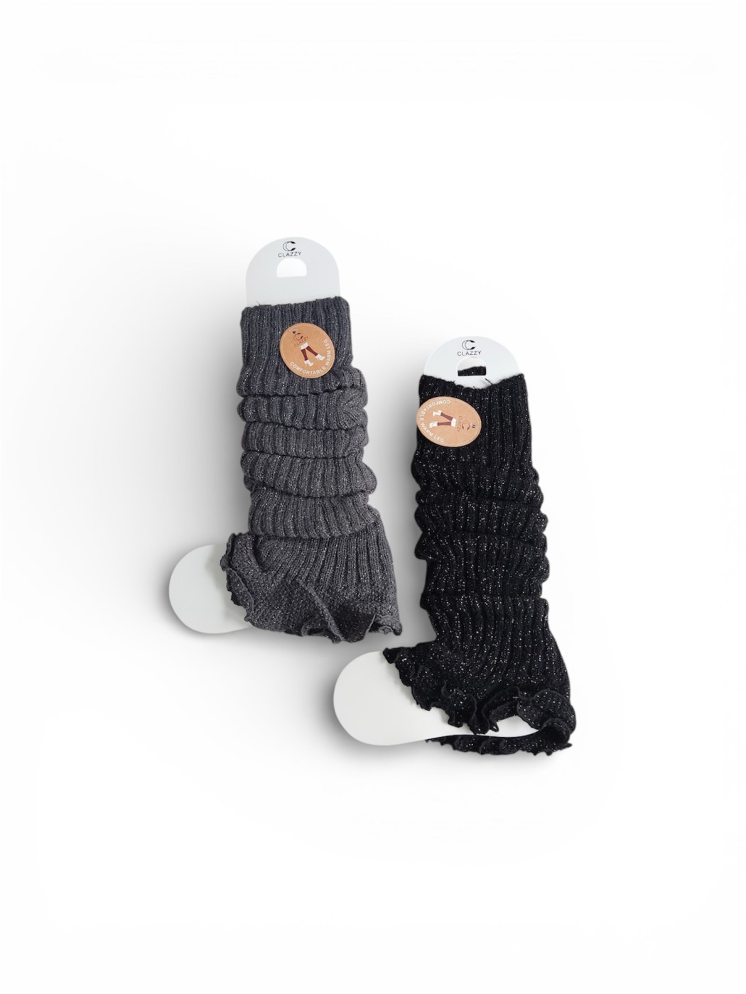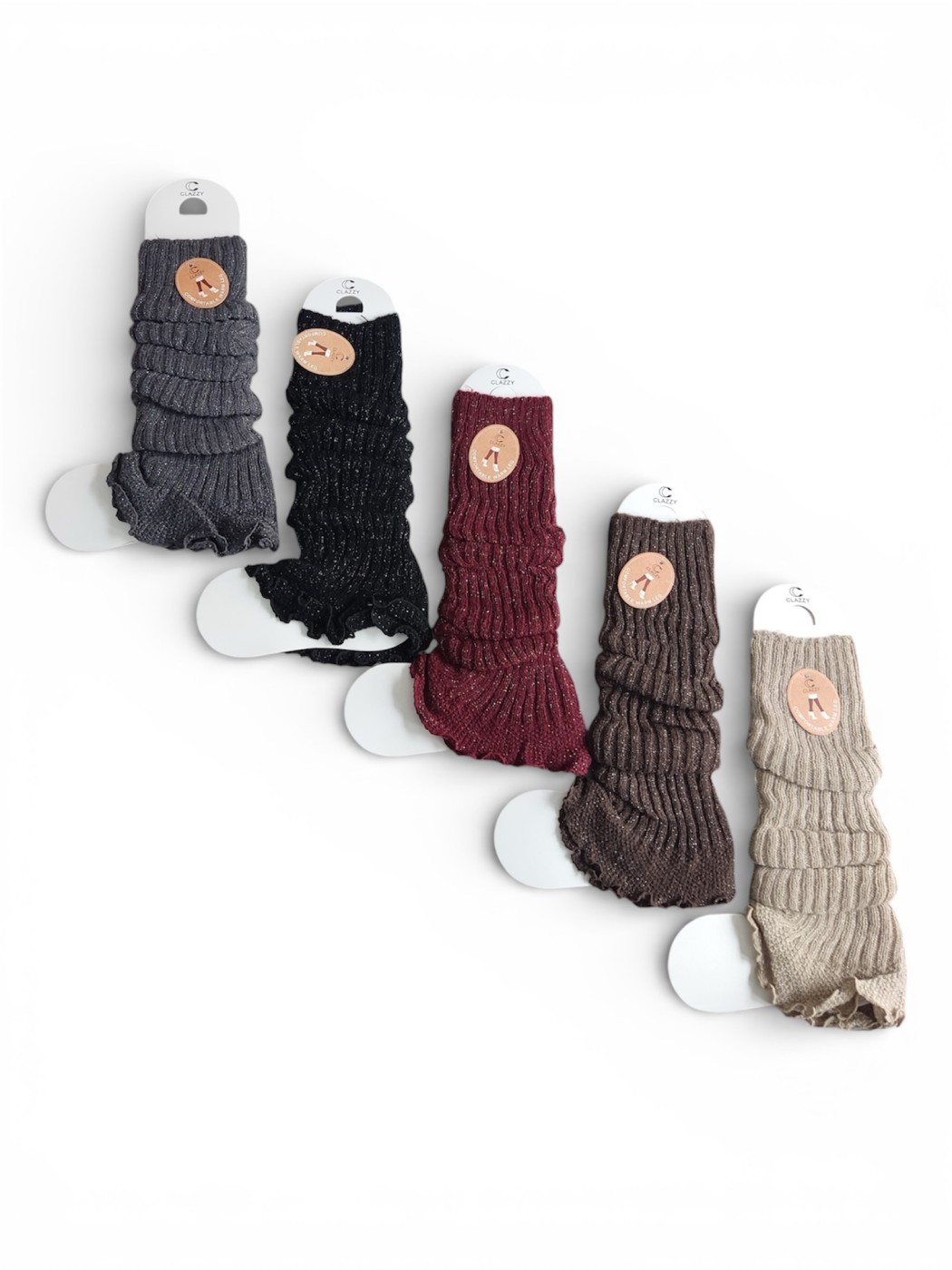 Calentadores Damaris. Calentadores de punto acanalado en una variedad de tonos con detalles brillantes. Están diseñados para ser usados de forma holgada, apilados o estirados, y cuentan con un ribete festoneado y ligeramente fruncido en el borde inferior.