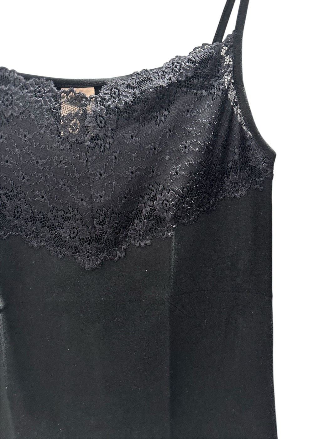 Camiseta tirante fino encaje. Camiseta de mujer con tiranta fina y encaje ancho a la altura del pecho. Tejido elástico de gran adaptabilidad. Algodón antialérgico.