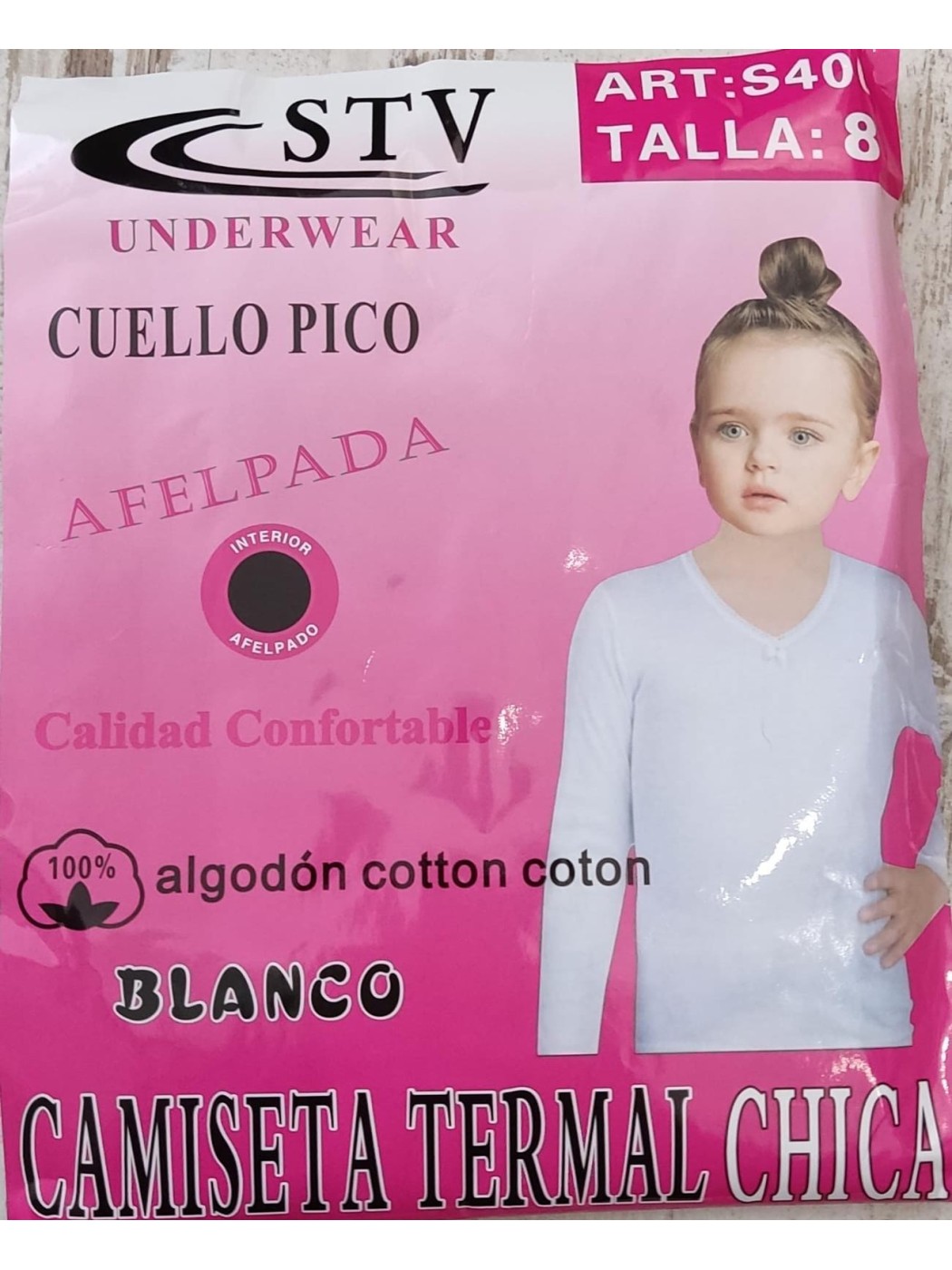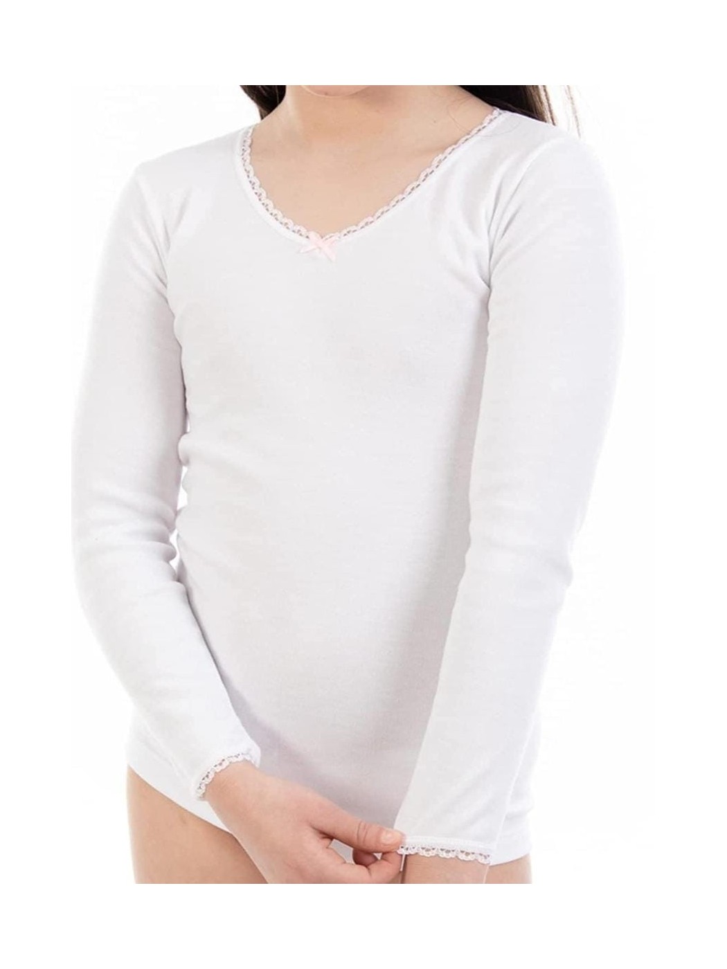CAMISETA INTERIOR THERMAL DE NIÑA AFELPADA EN SU INTERIOR. 100% ALGODON. CONTIENE CUELLO DE PICO Y A SU ALREDEDOR PUNTILLITA CON LAZO CENTRAL. CUENTA CON LA MISMA PUNTILLITA EN LOS PUÑOS. CALIDAD CONFORTABLE.