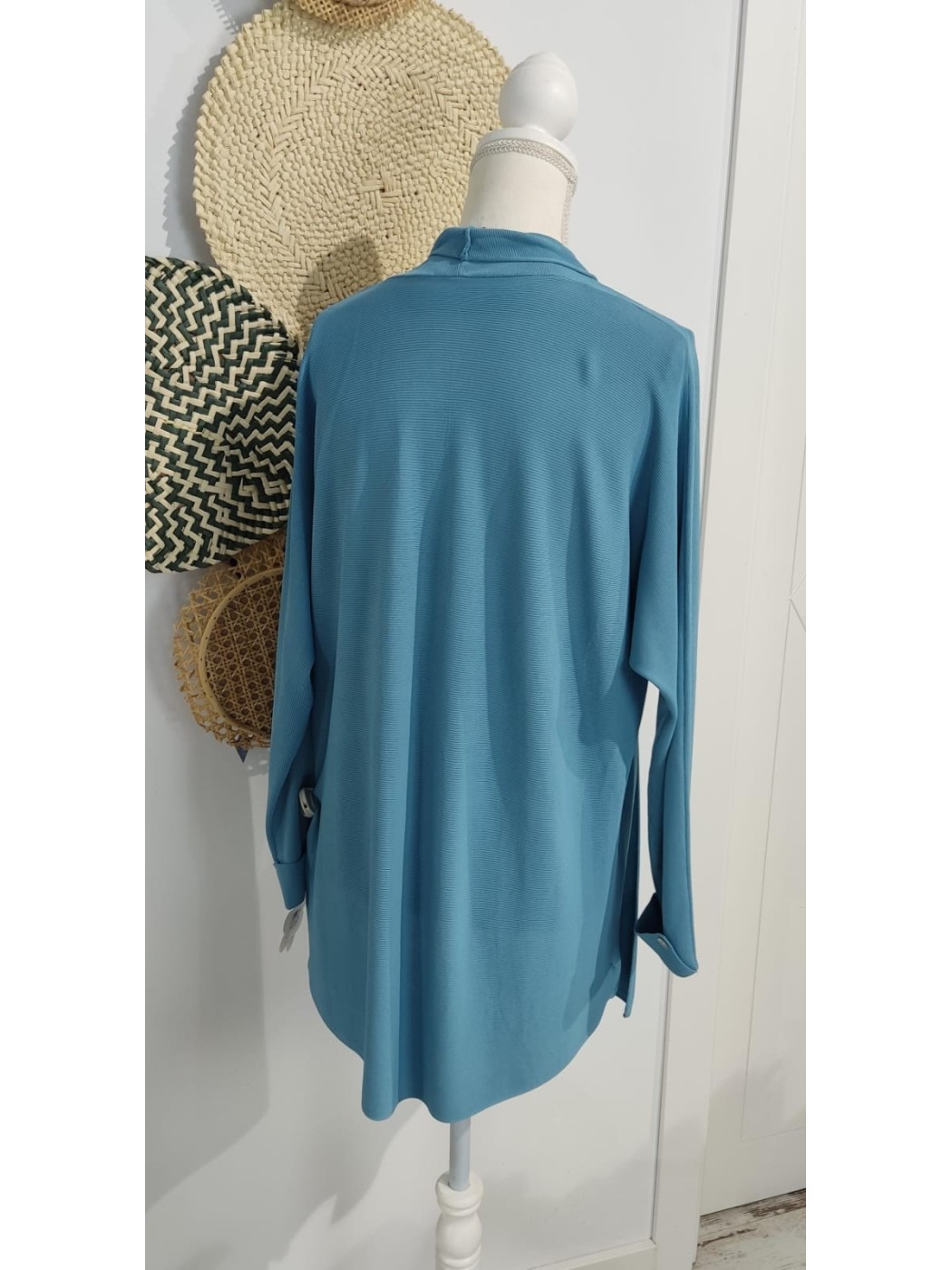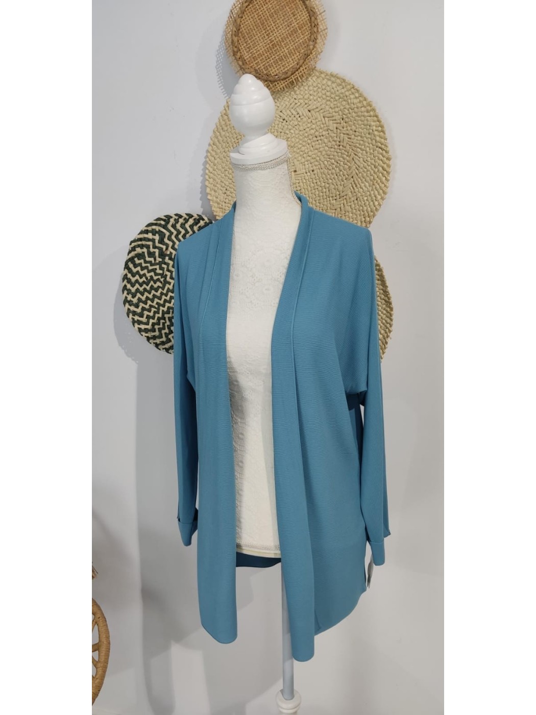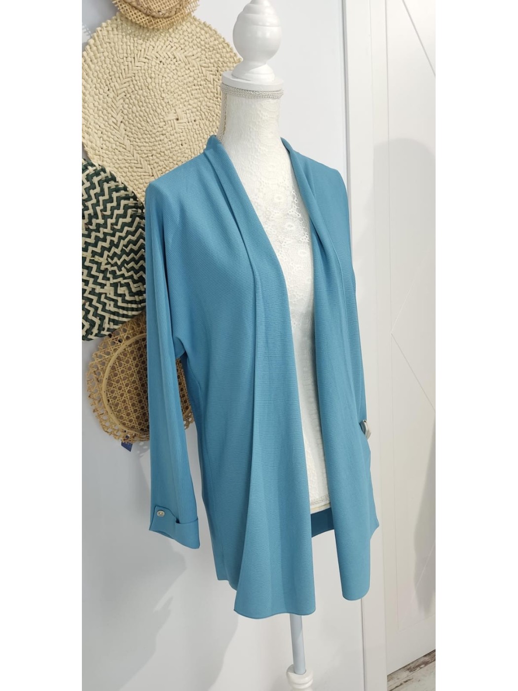 REBECA LOLITA. CUENTA CON MANGA LARGA Y VUELTA EN EL CUELLO Y EN LA SOLAPA. TEJIDO FINO DE CANALE ENGOMADO. TALLA UNICA CON UN MARGEN DE 36 A 46/48.