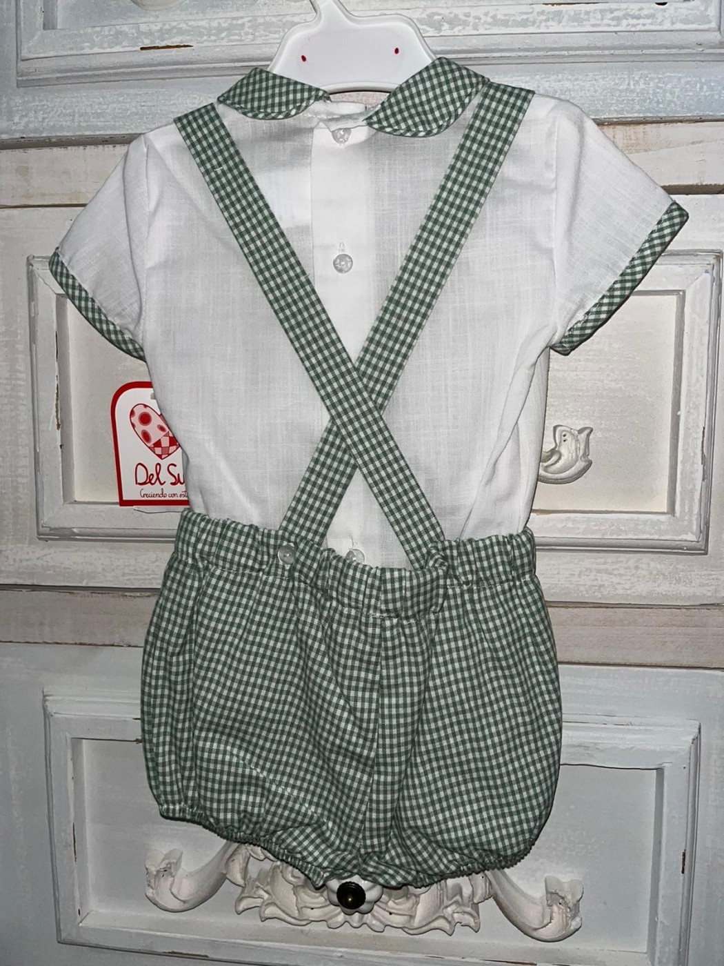 conjunto de dos piezas bebé niño cuadros vichy. Pantalón ranita con cintura y piernas engomadas. Camisa con cuello bebé y borde de mangas con cuadros vichy, abotonada por la parte trasera. tirantes cruzados por la parte trasera.