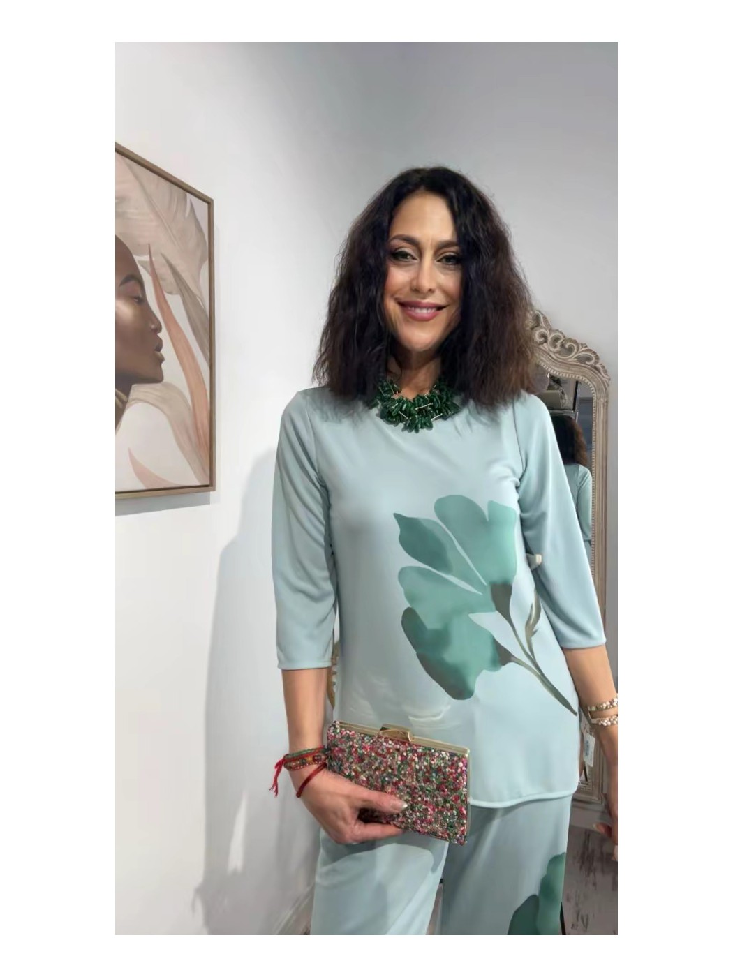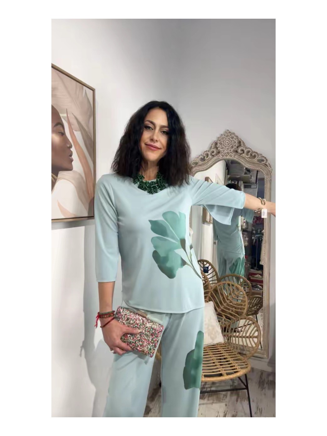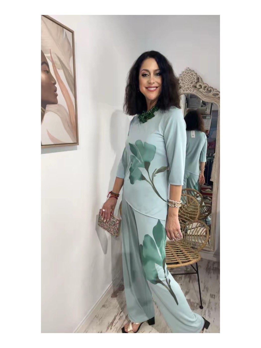 Trajes de Flamenca Mantones de Flamenca Pendientes de Flamenca Flores de Flamenca Broches de Flamenca Peinetas FlamencasConjunto Begoña ADET. blusa con estampado de flor y pico desigual. Pantalón con cinturilla engomada y corte recto. La talla ´M´de ADET puede dar hasta una 42.