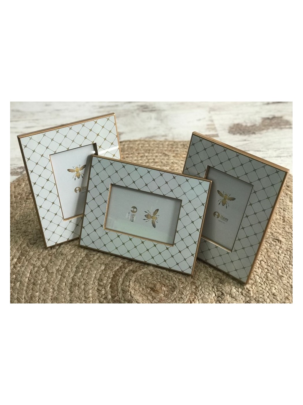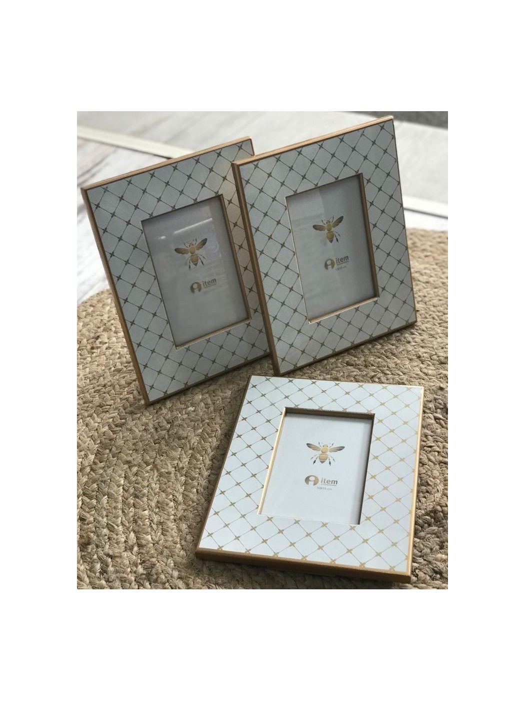 Marco foto mdf simil marqueteria, fondo blanco y lineas en color oro, medidas; 10 x 15 cm.