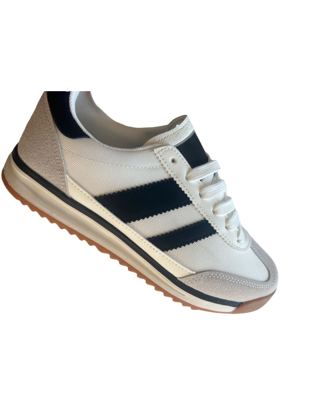 Deportivas Maldivas. ¡Descubre el estilo retro con nuestras nuevas zapatillas! La parte superior de lona blanca de se complementa con tres franjas negras icónicas, ofreciendo un toque elegante y deportivo. Los detalles de ante en la puntera y el talón añaden textura y durabilidad. La suela de goma de color crema proporciona un excelente agarre y amortiguación para que puedas disfrutar de todo el día sin sacrificar el confort. Unas zapatillas perfectas para cualquier ocasión, desde un look casual hasta un outfit más arreglado.