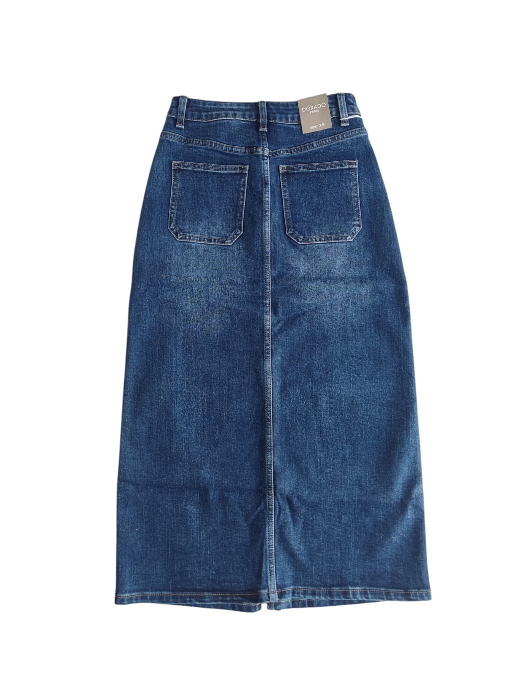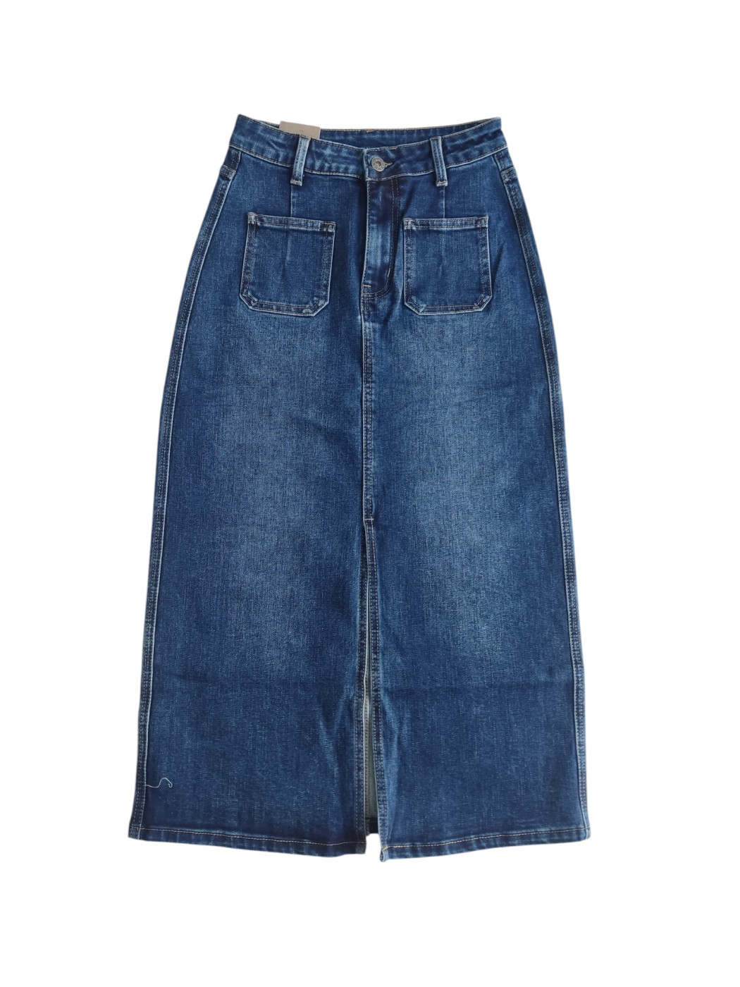 Falda vaquera Liss. Cuenta con botón y cremallera. Cuenta dos bolsillos delanteros y dos traseros. Abertura en la parte delantera.