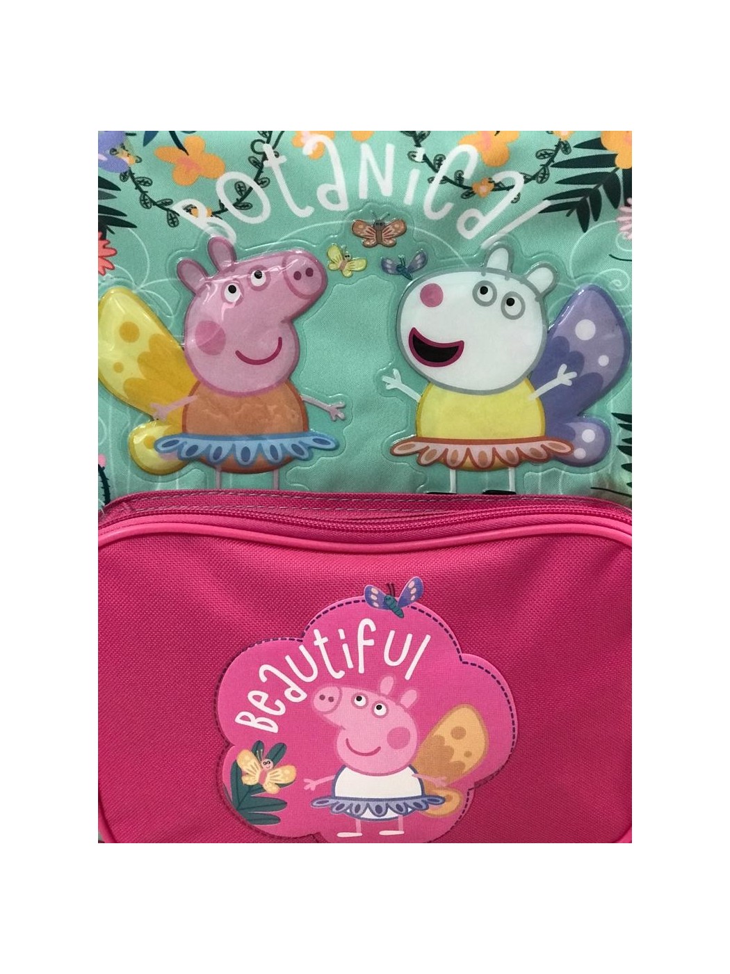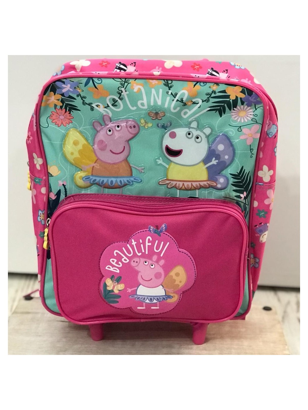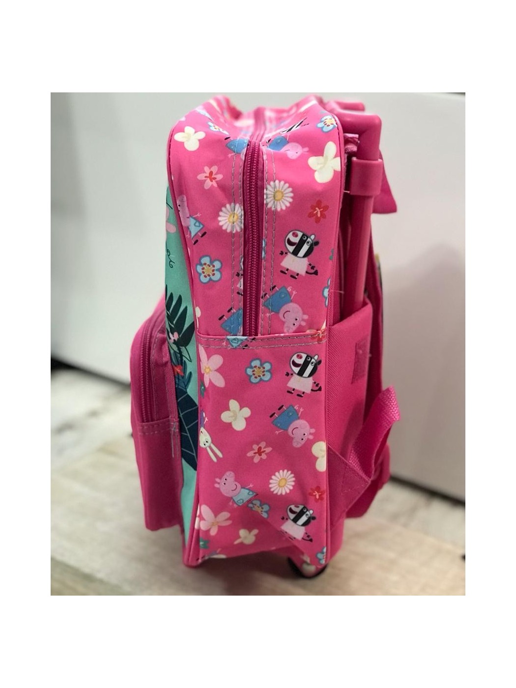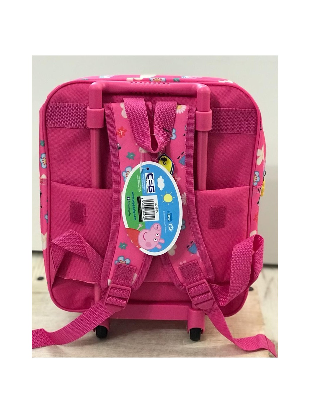 MOCHILA CON CARRO PEPPA PIG. CONTIENE ASAS REGULABLES EN LA PARTE TRASERA ADEMAS DE ASAS Y RUEDAS. LLEVA BOLSILLO GRANDE CENTRAL Y MEDIANO DELANTERO, AMBOS CON CIERRE DE CREMALLERA. MEDIDAS APROXIMADAS DE 30X32CM. ALTURA CON ASA LEVANTADA 52CM.