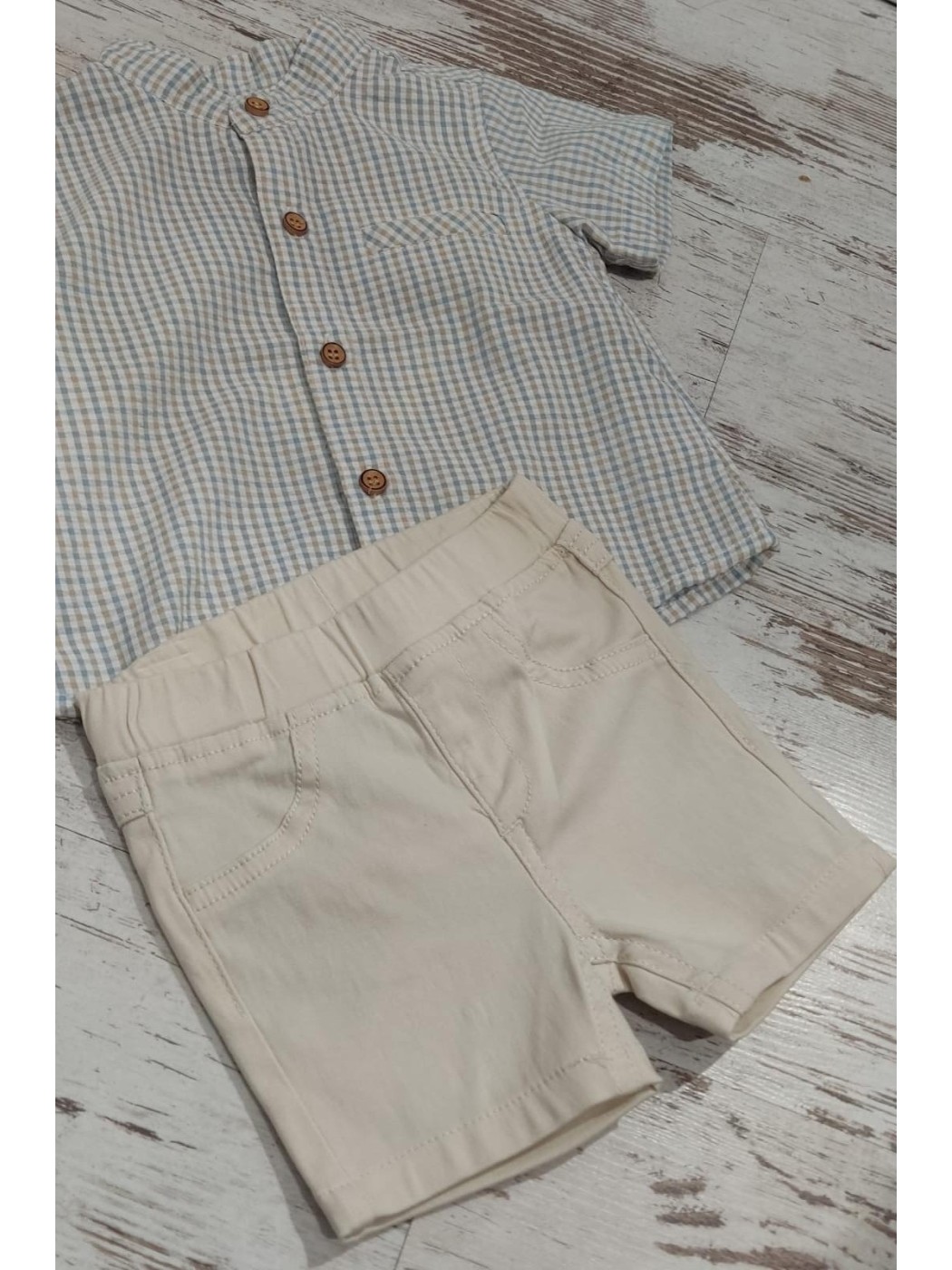 SHORT DE NIÑO CON TEJIDO ENGOMADO Y BOLSILLOS EN LA PARTE TRASERA. EN LA CINTURILLA CUENTA CON ELASTICO. ¿LO COMBINAMOS CON LA CAMISA DE CUADROS VICHY?