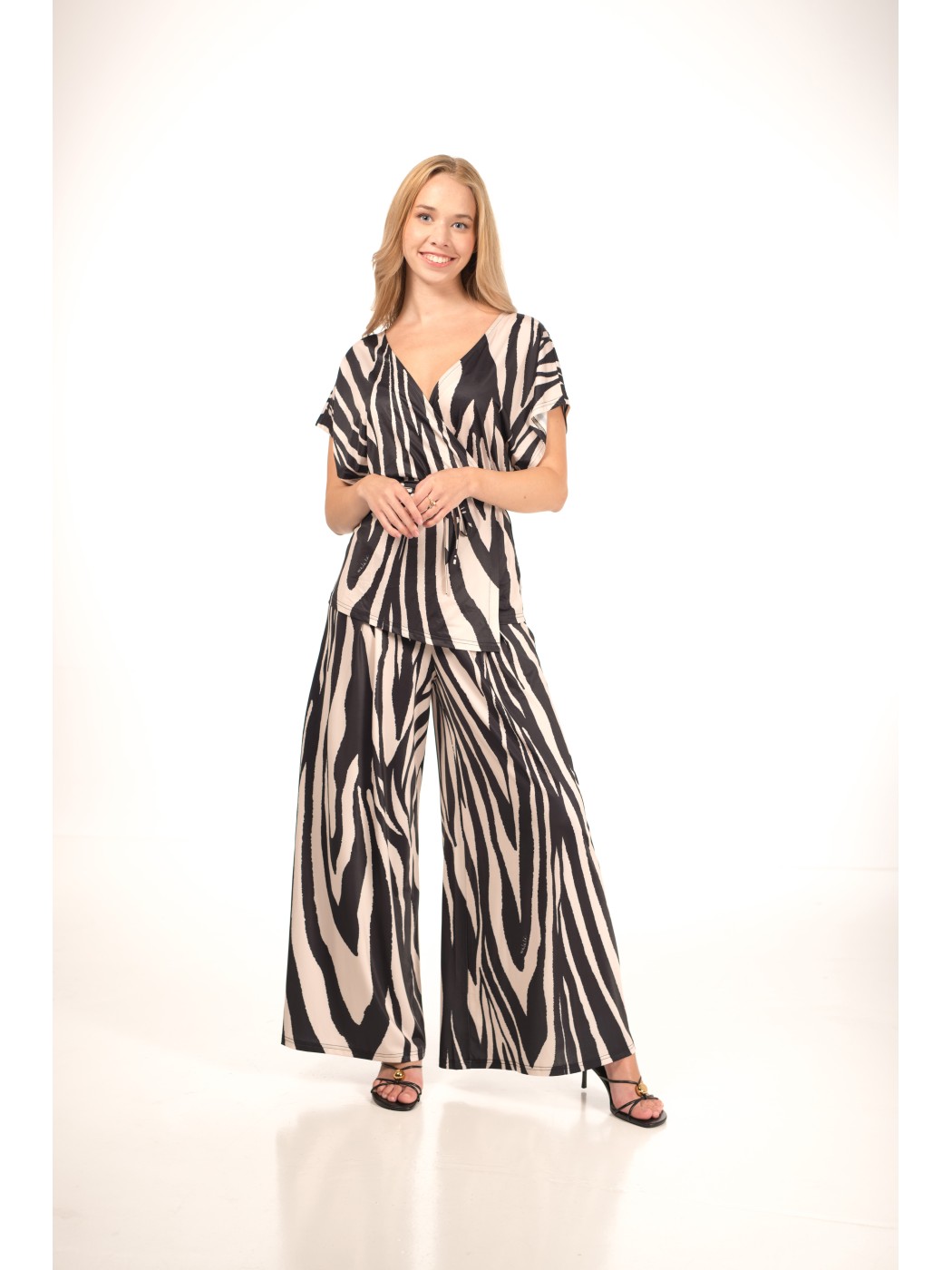 Pantalón Astu Malalá. Efecto palazzo. Corte de pernera ancha con pinzas delanteras que crean un movimiento elegante y con volumen. Diseño de bolitas colgante en la cinturilla delantera.