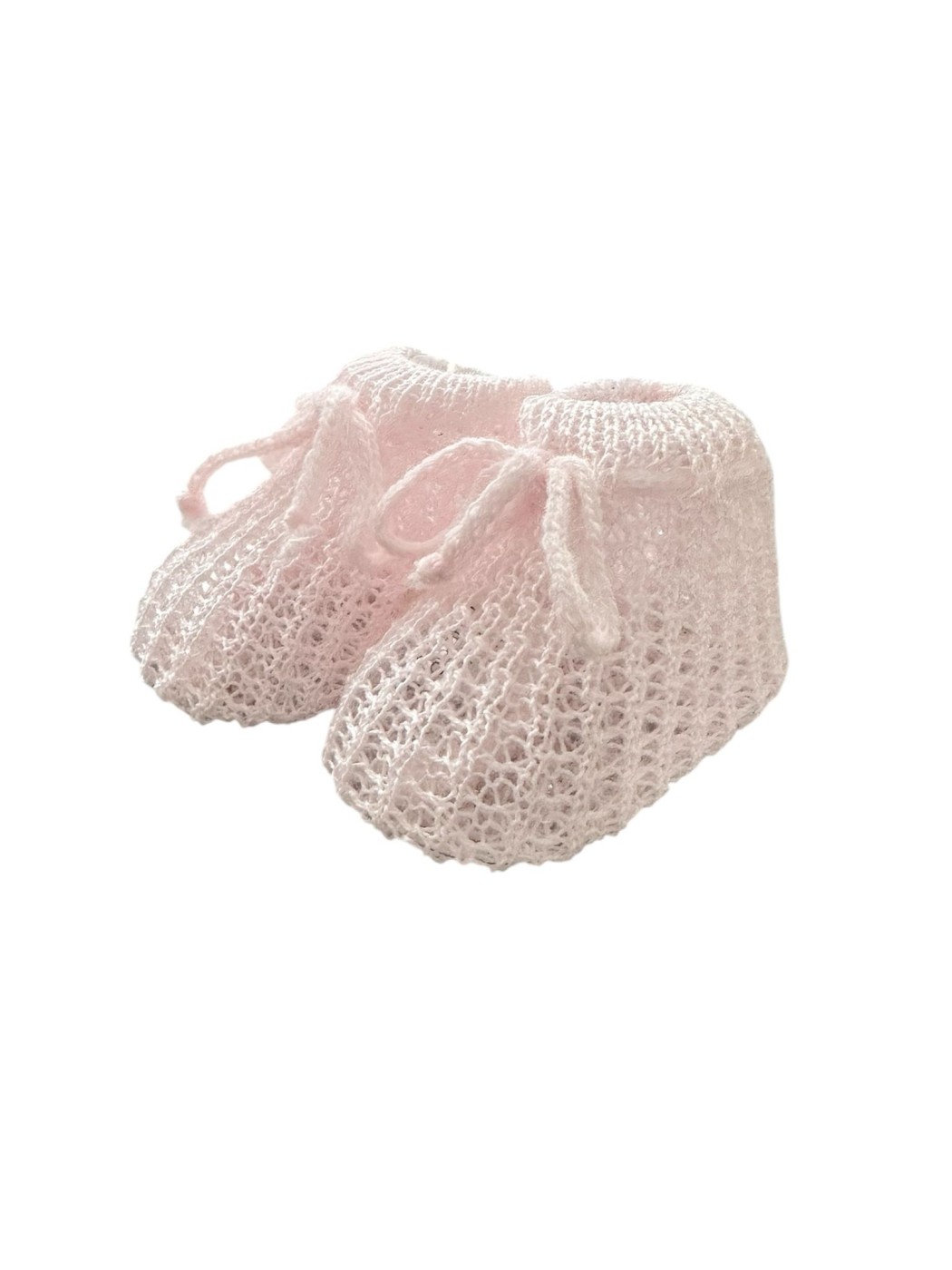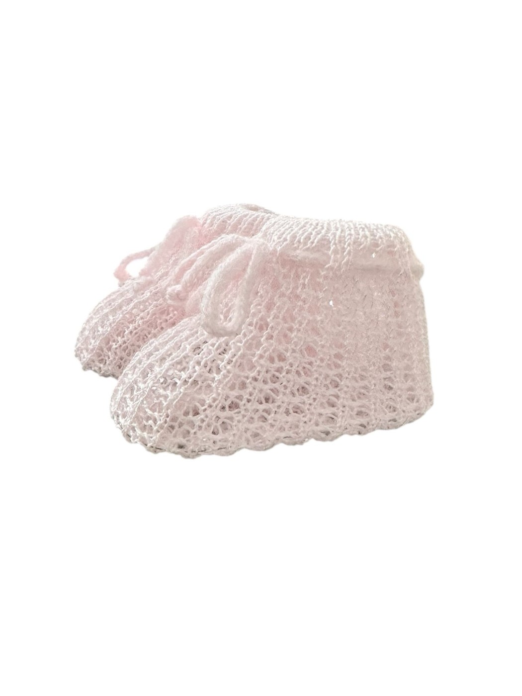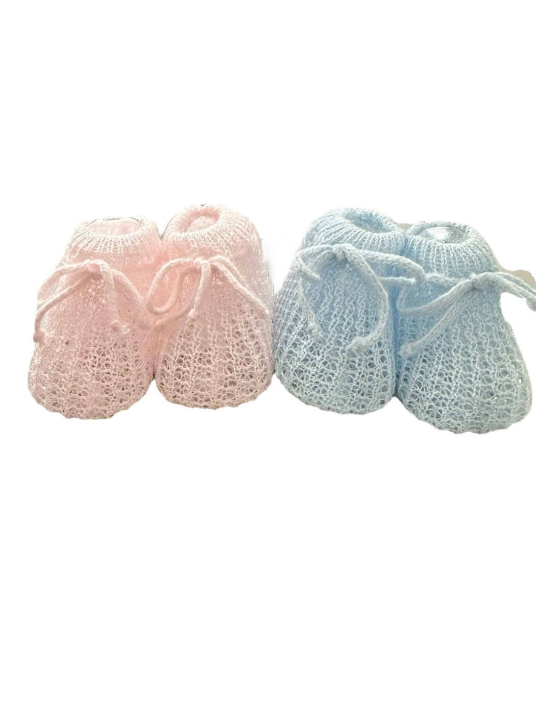 Patucos bebé Alegria. Encantadores patucos de punto para bebé, disponibles en rosa y azul celeste.  Suave tejido de encaje, ideales para recién nacidos.