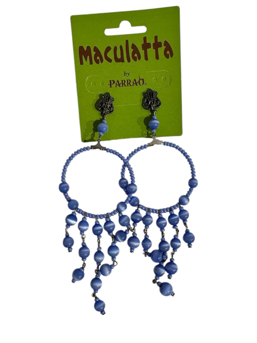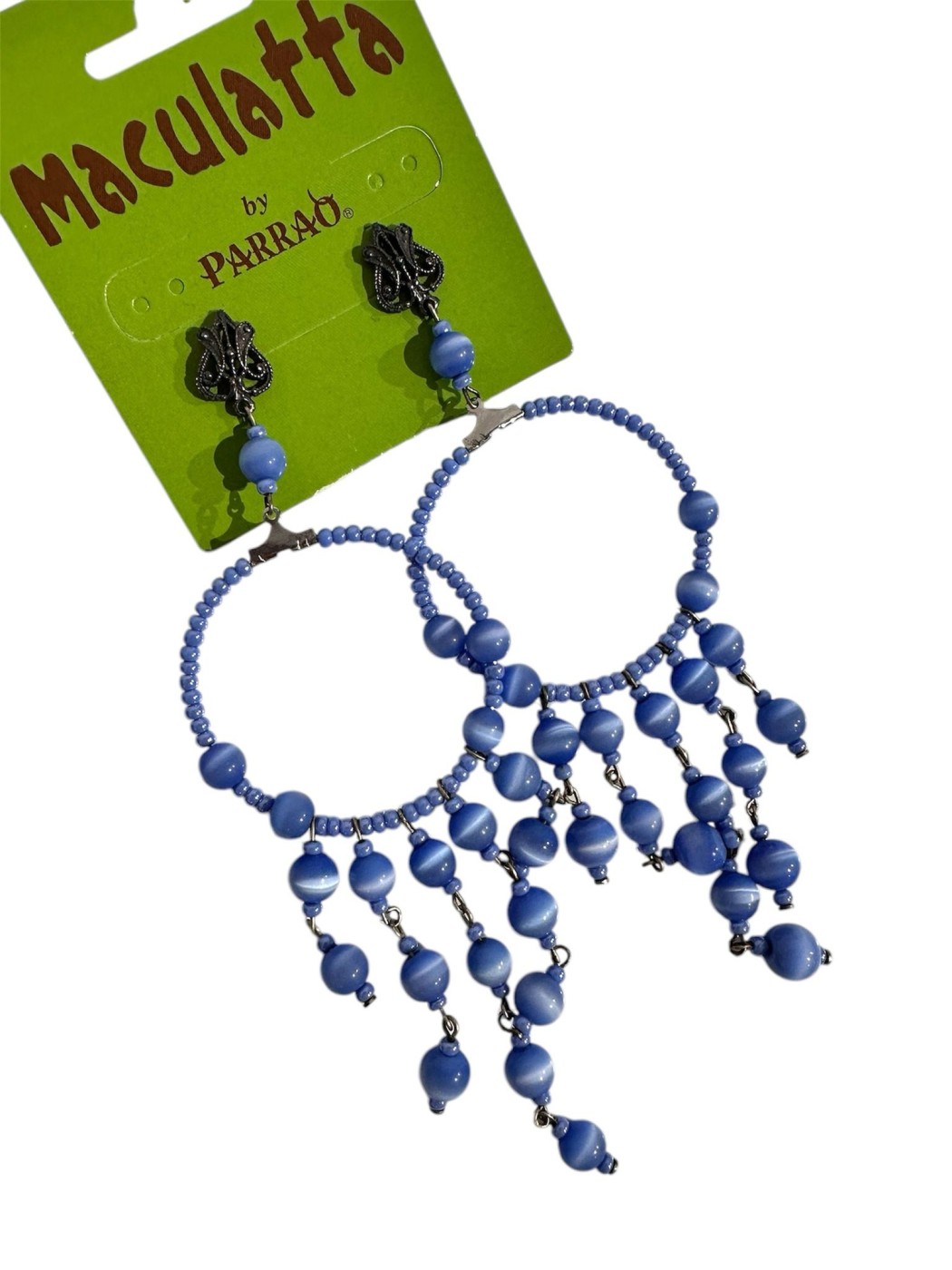 Pendiente Ajoli. Los pendientes presentan un aro circular de pequeñas cuentas azules perladas, creando una base sutil pero llamativa. De este aro cuelgan delicados flecos compuestos por cuentas de cristal azul, que evocan una sensación de movimiento y ligereza.