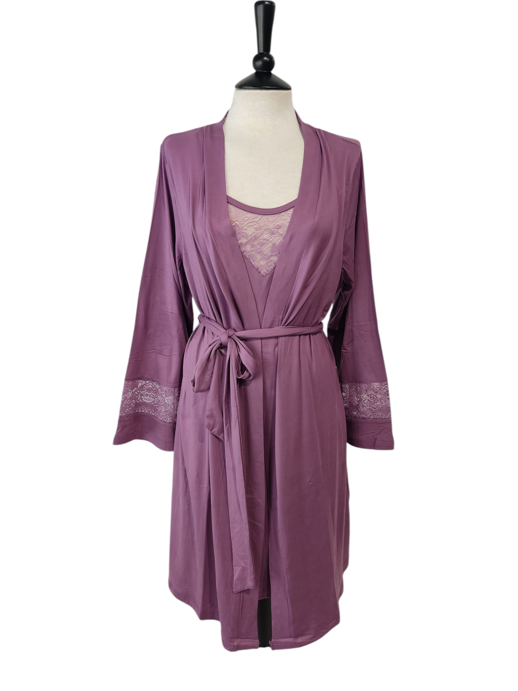 Camisón y bata con encaje. Camisón con tiranta regulable y engomado en espalda. Cuenta con escote de encaje al tono. Bata con lazada en cintura y encaje en mangas y en espalda. Textura súper agradable. Cómodo y elegante.