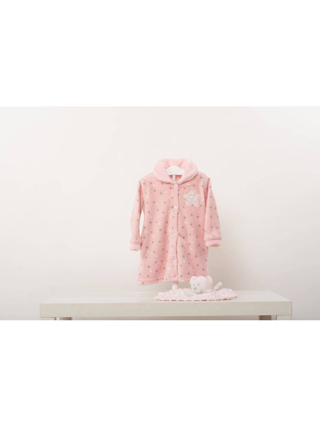 BATA KINANIT BEBÉ CORALINA PLANET. PRECIOSA BATA INFANTIL DE CORALINA QUE DESTACA POR SU SUAVIDAD Y SU BONITO DISEÑO ESTAMPADO CON ESTRELLA EN GRIS Y BLANCO. ESTA BATA ES ABOTONADA CON DOS BOLSILLOS LATERALES Y CUELLO BEBÉ.