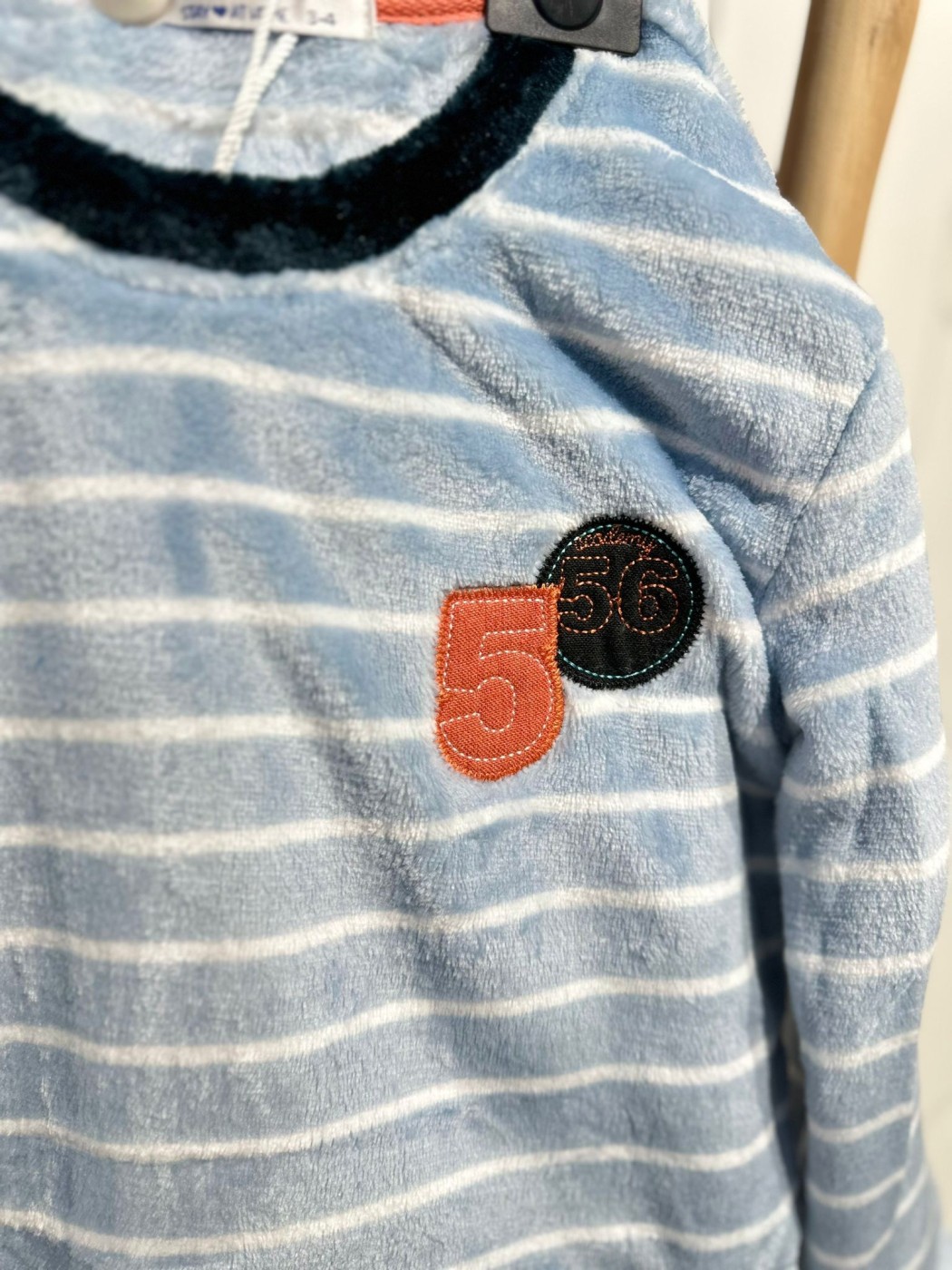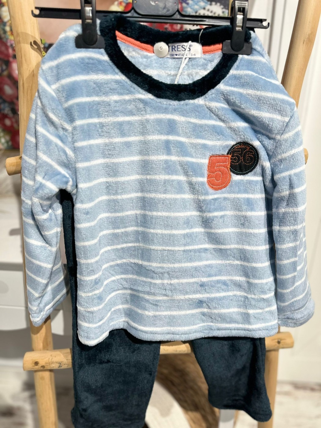 PIJAMA NIÑO TRESS. PIJAMA DE NIÑO DE LA MARCA TRESS COMPUESTO POR CAMISETA DE PELITOS CON RAYAS HORIZONTALES Y BORDADO EN UN LATERAL CON EL NÚMERO5 Y PANTALÓN CON CINTURRILLA ELÁSTICA Y CUERDA. DIFERENTES TALLAS Y DOS COLORES DISTINTOS.