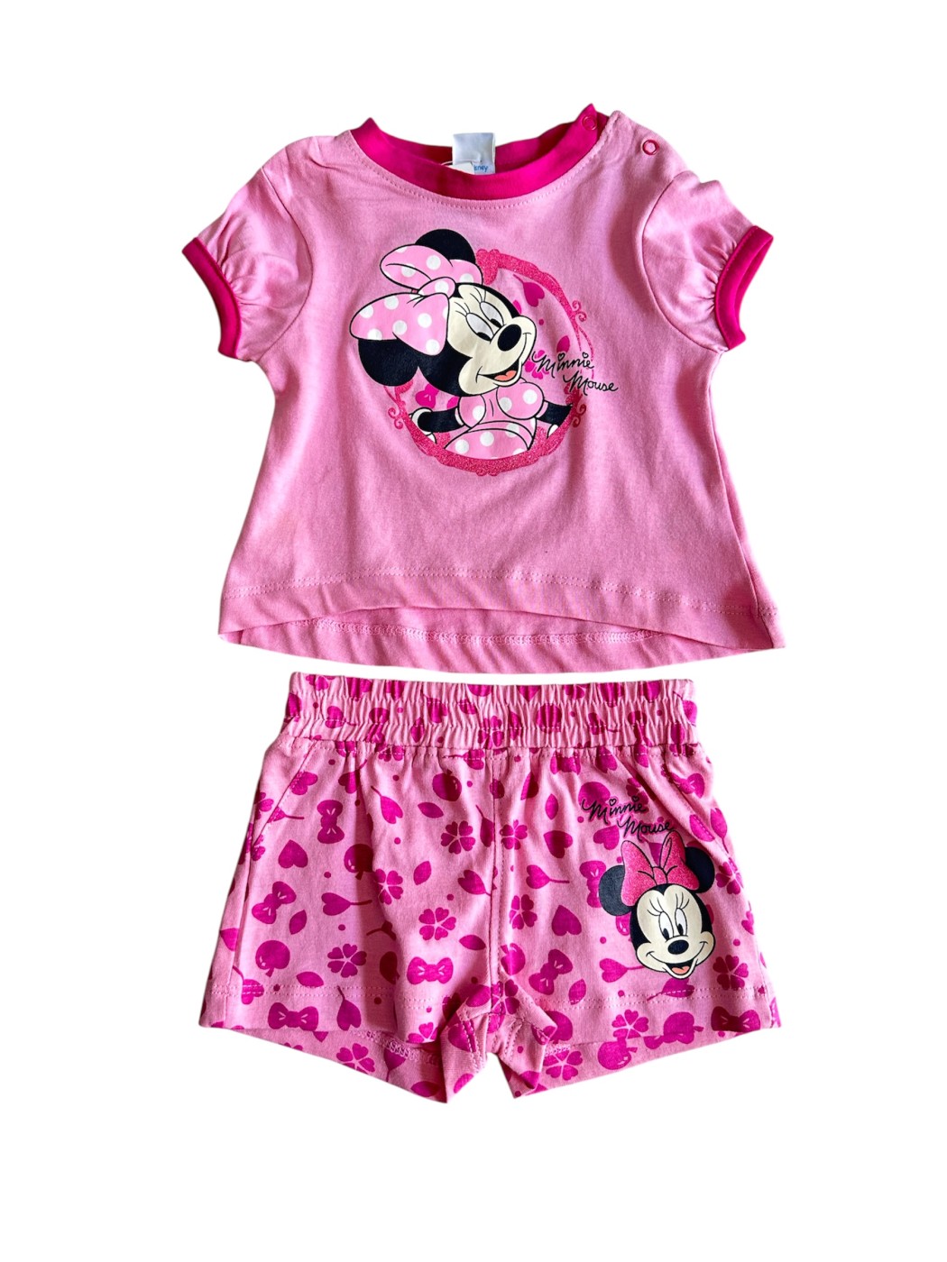 Pijama Minnie Mouse bebé. Pijama de bebé niña con pantaloncito de cinturilla elástica y estampado de otro tono de rosa y una imagen de minni en un lateral. Por otro lado, camiseta de manga corta con estampado de minnie central.