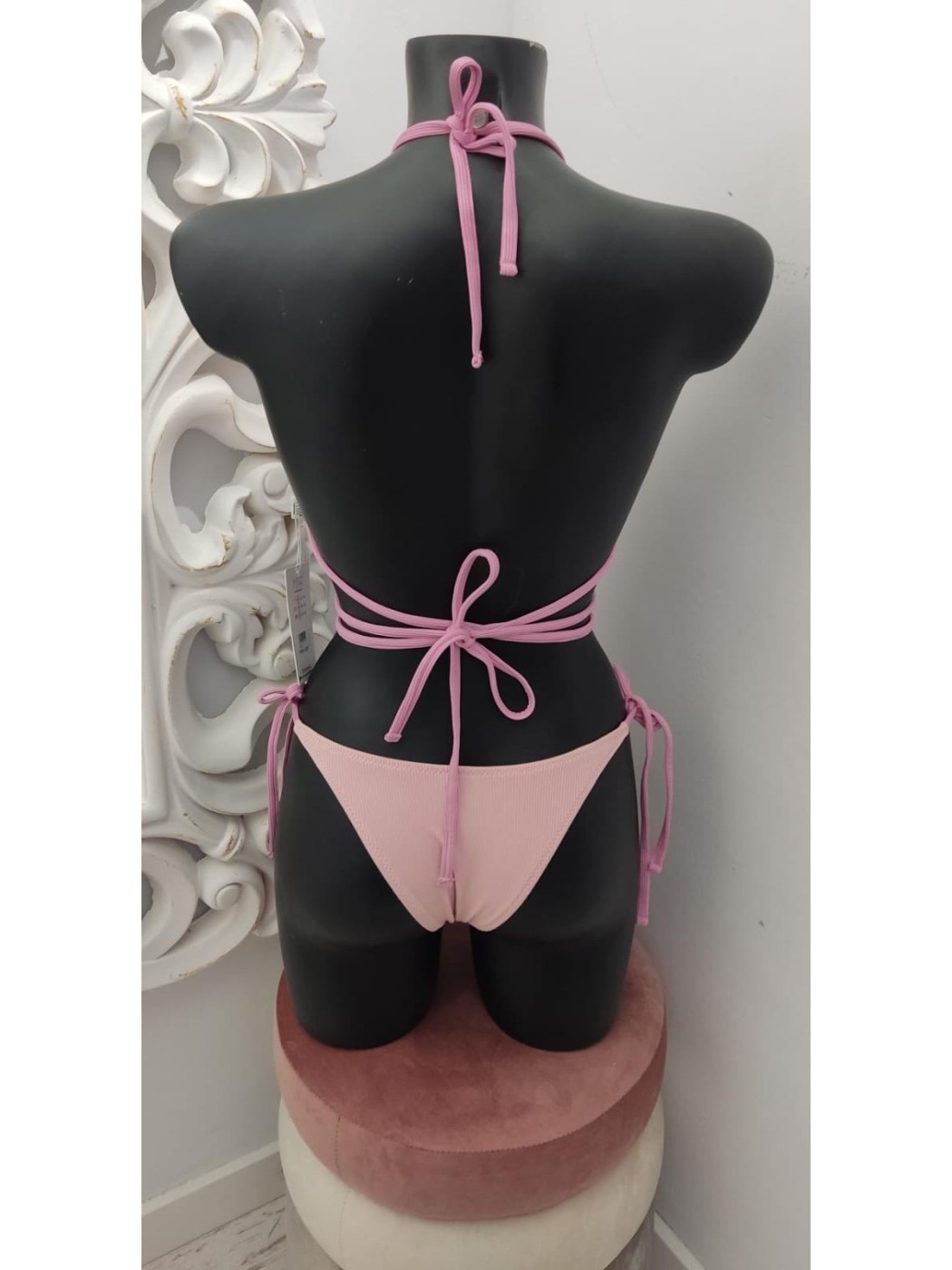 biquini doble vuelta. Contiene cuerdas largas para poner dar doble vuelta al abdomen. La braguita lleva lazada en sus laterales para poder adaptar.