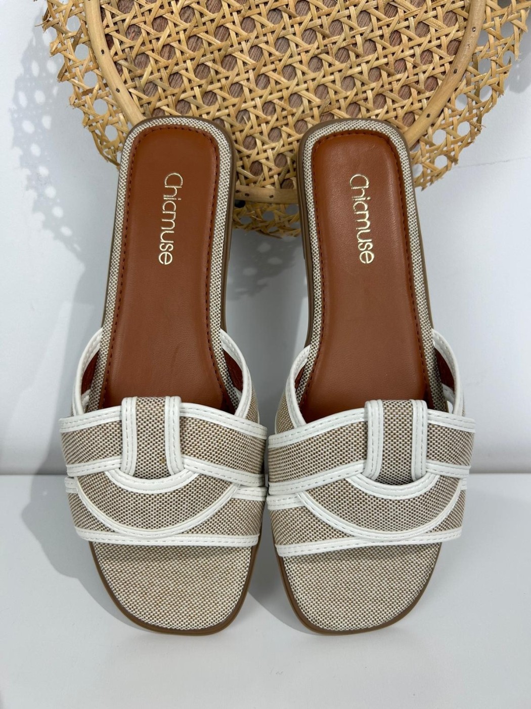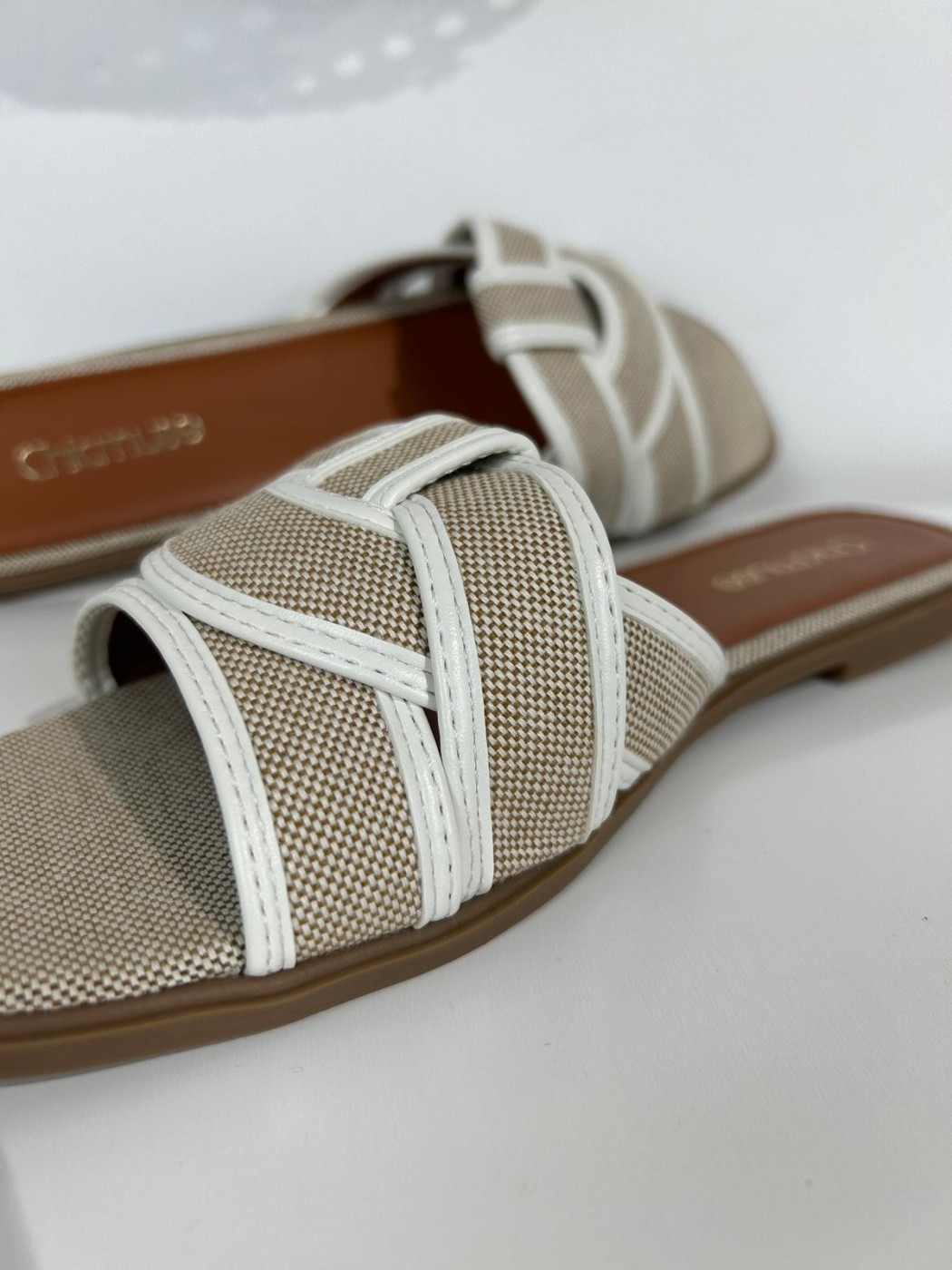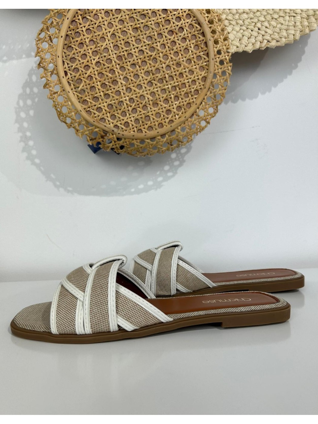 SANDALIA LAURA. SANDALIAS PLANAS DE MUJER CON DISEÑO DE TIRAS CRUZADAS Y COLOR BEIG Y BLANCO, PERFECTAS PARA CUALQUIER OCASIÓN. SANDALIA CON TALLAJE NORMAL.