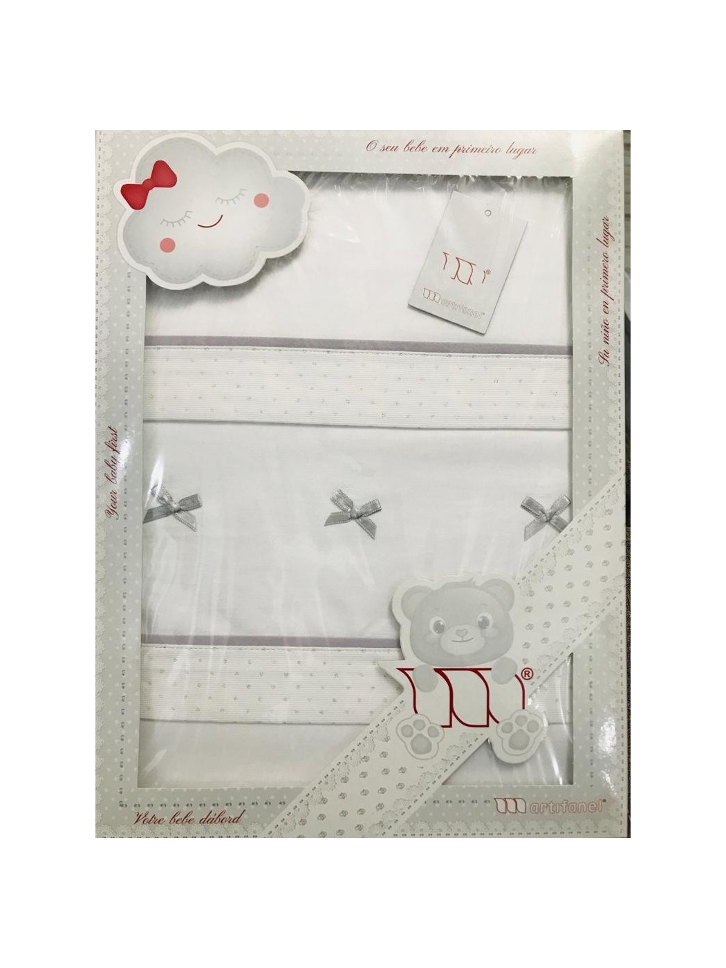 JUEGO DE SABANAS DE CUNA CIELO. CONTIENE PEQUEÑOS LACITOS EN EL EMBOZO.