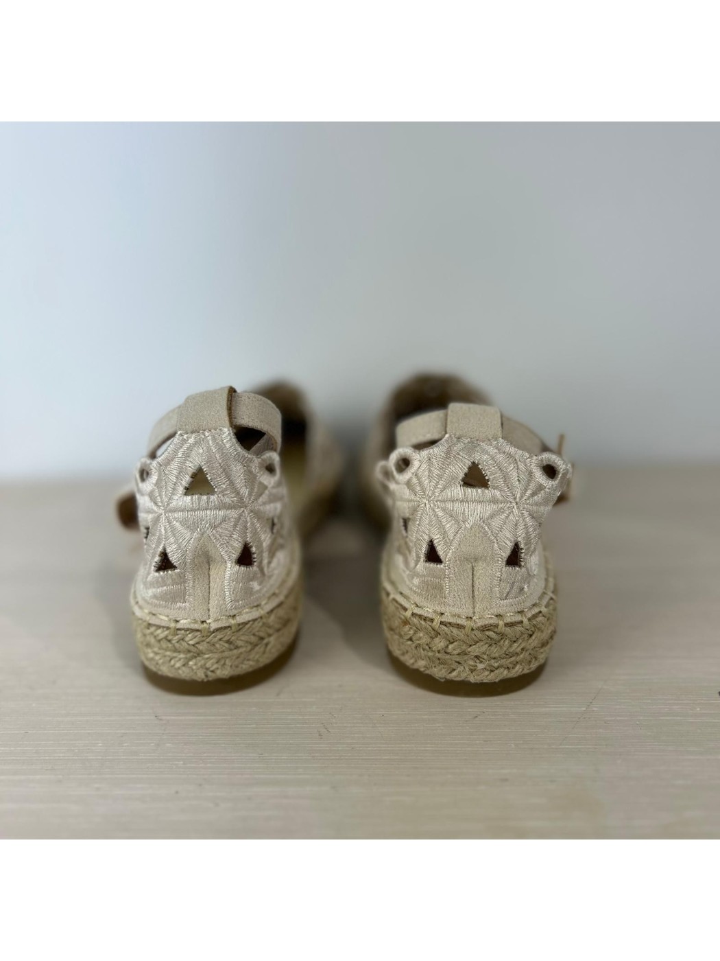 ESPARTO LOLA PLANA. CUENTA CON EMPEINE Y TALONERA CON CALADO DE FLORES. HEBILLA CON SUJECION AL TOBILLO. LLEVA DE PLATAFORMA 2.5CM.