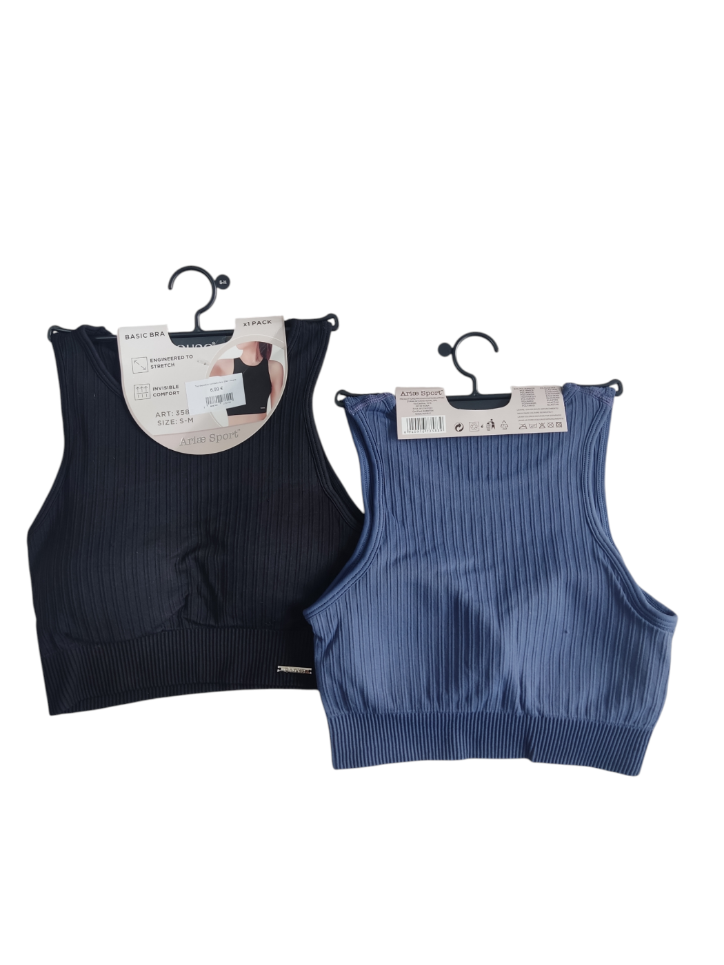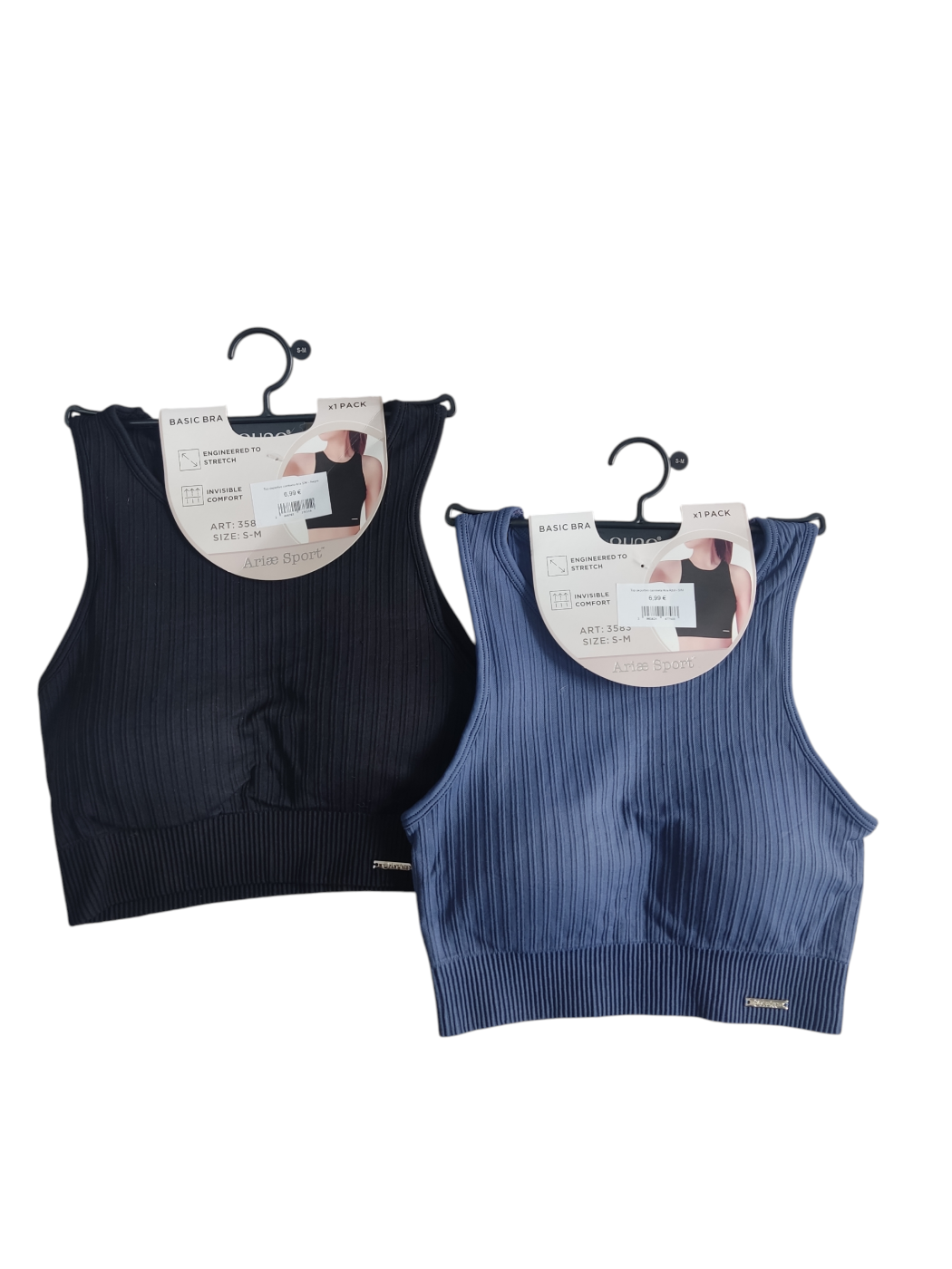 Top deportivo camiseta Aria. Top tipo camiseta de canalé engomado con gorros en el pecho. Invisible confort.