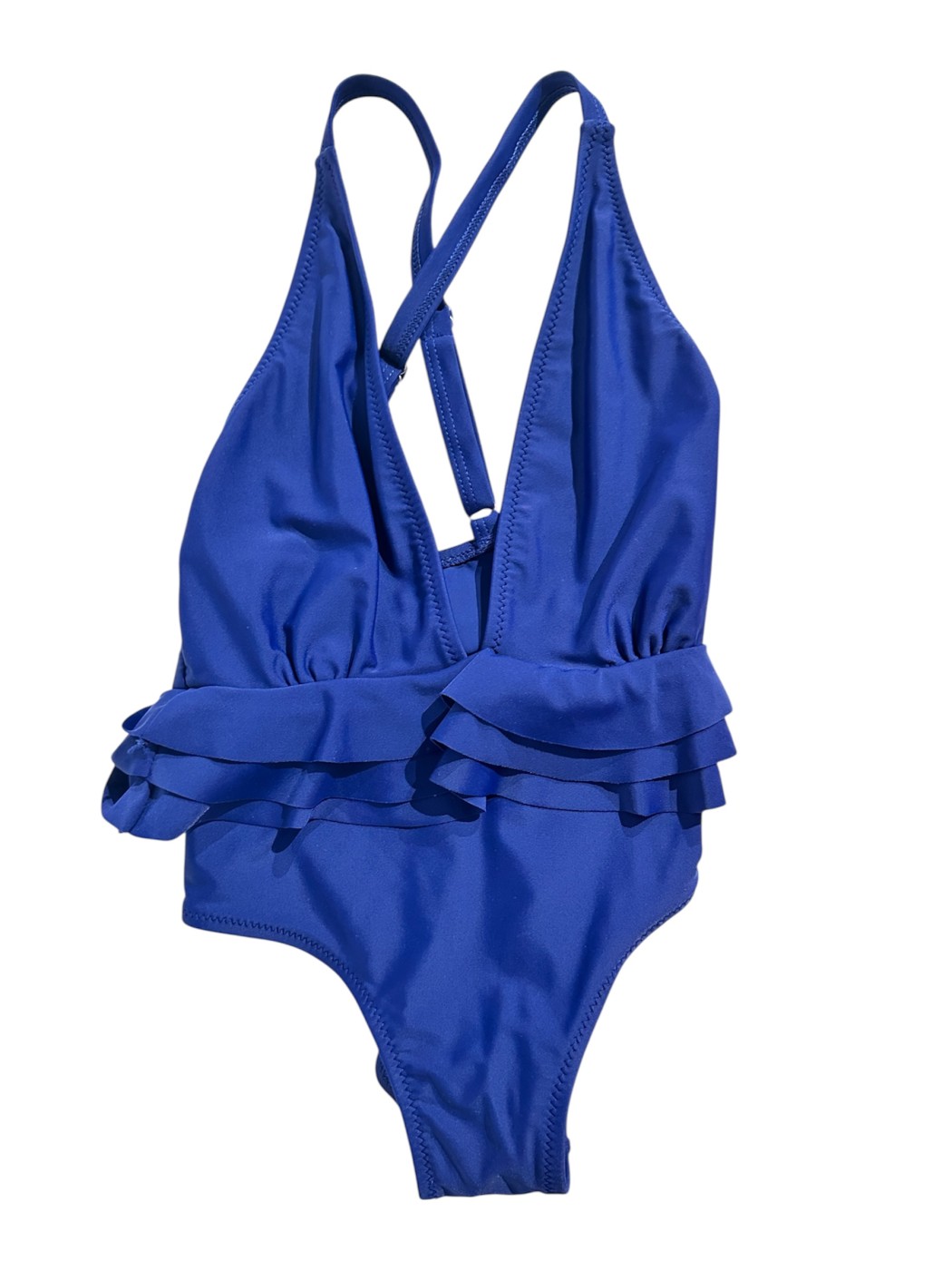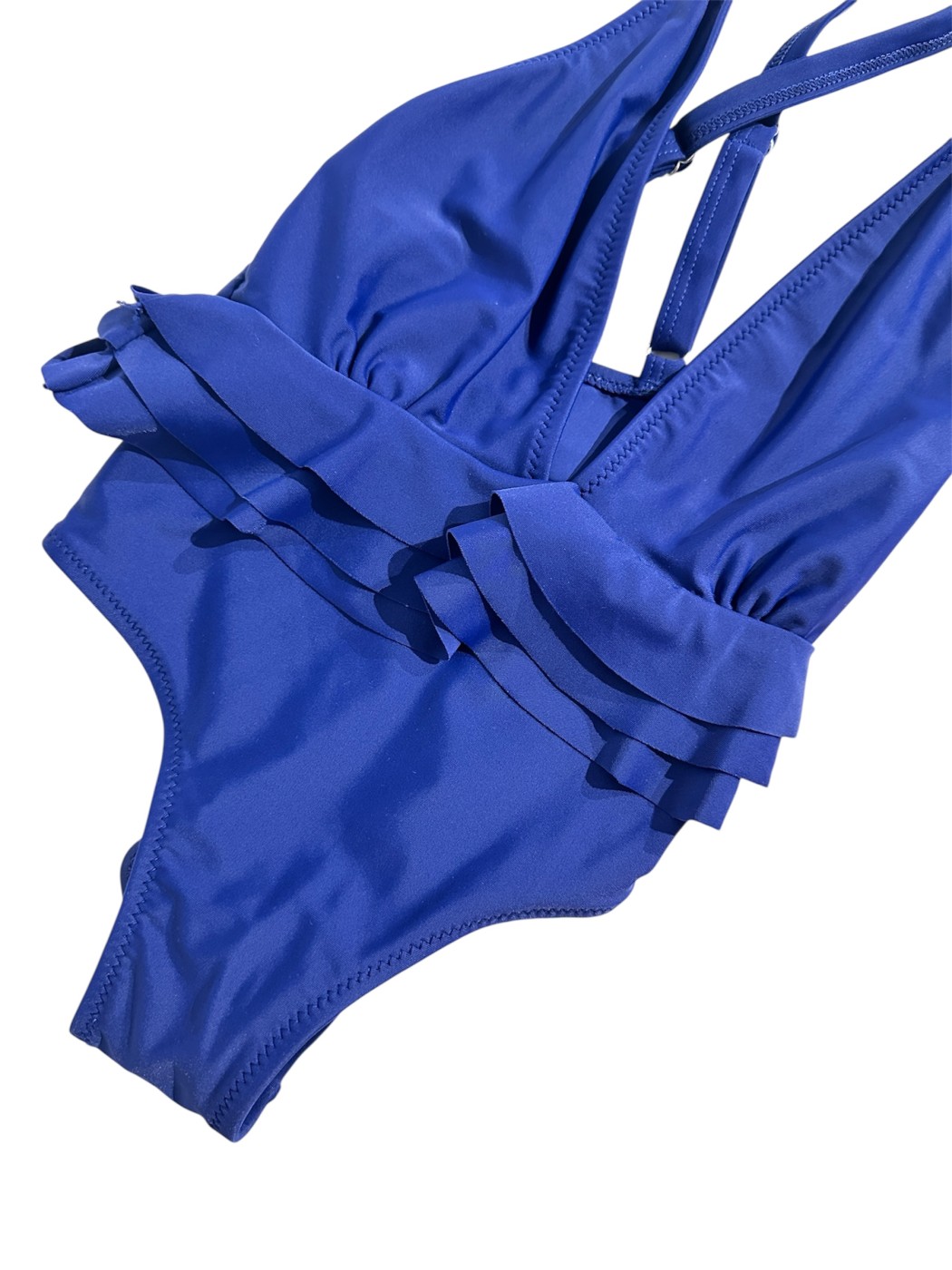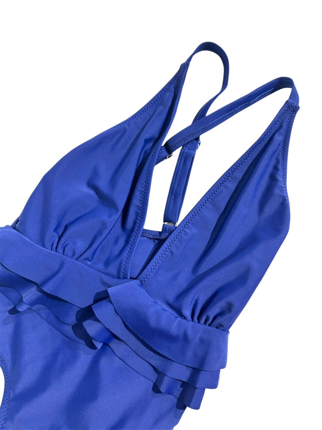 Bañador Zoe niña. Bañador de niña con tirantas cruzadas y volantes en la zona de la barriga.