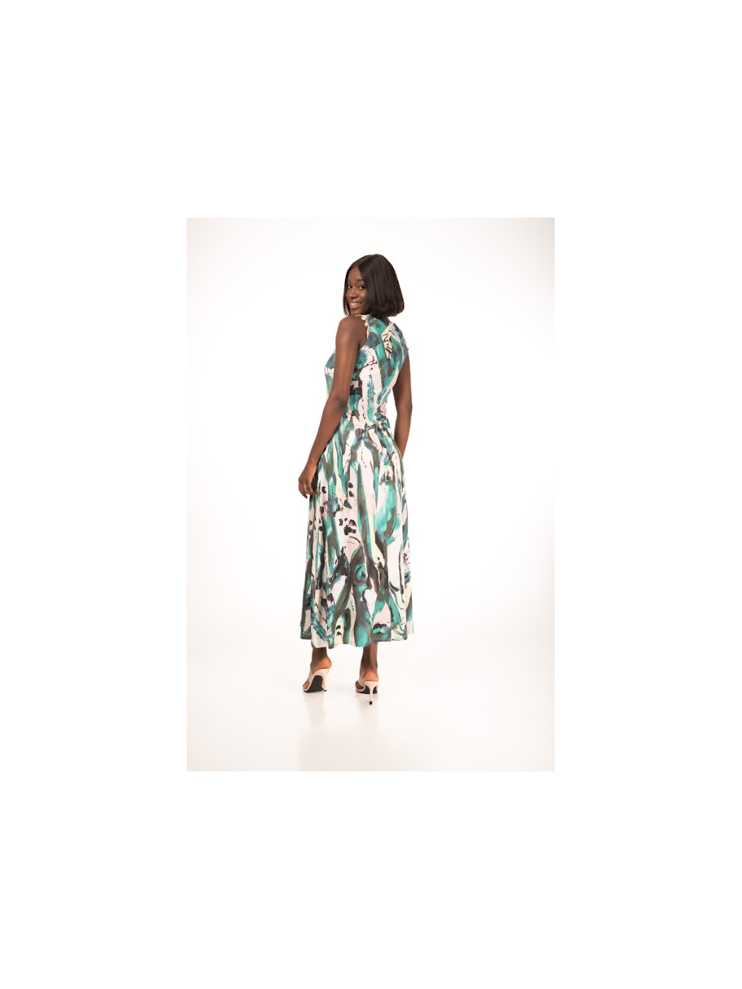 Trajes de Flamenca Mantones de Flamenca Pendientes de Flamenca Flores de Flamenca Broches de Flamenca Peinetas FlamencasVestido Akbal Malalá. Es un diseño de la marca Malalá de silueta evasé, sin mangas, cuello redondo y estampado abstracto.