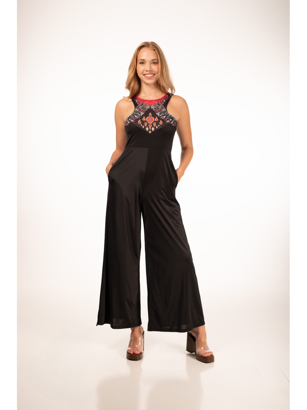 Mono Eternidad Malalá. Este mono destaca por fusionar una silueta moderna con detalles de inspiración étnica, creando una pieza única y llena de personalidad. El corte del pecho que sube hacia el cuello es extremadamente favorecedor, ya que despeja los hombros y estiliza la parte superior del cuerpo.  La parte inferior de pernera muy ancha aporta una caída fluida y elegante que imita el movimiento de una falda, ofreciendo comodidad sin perder sofisticación.