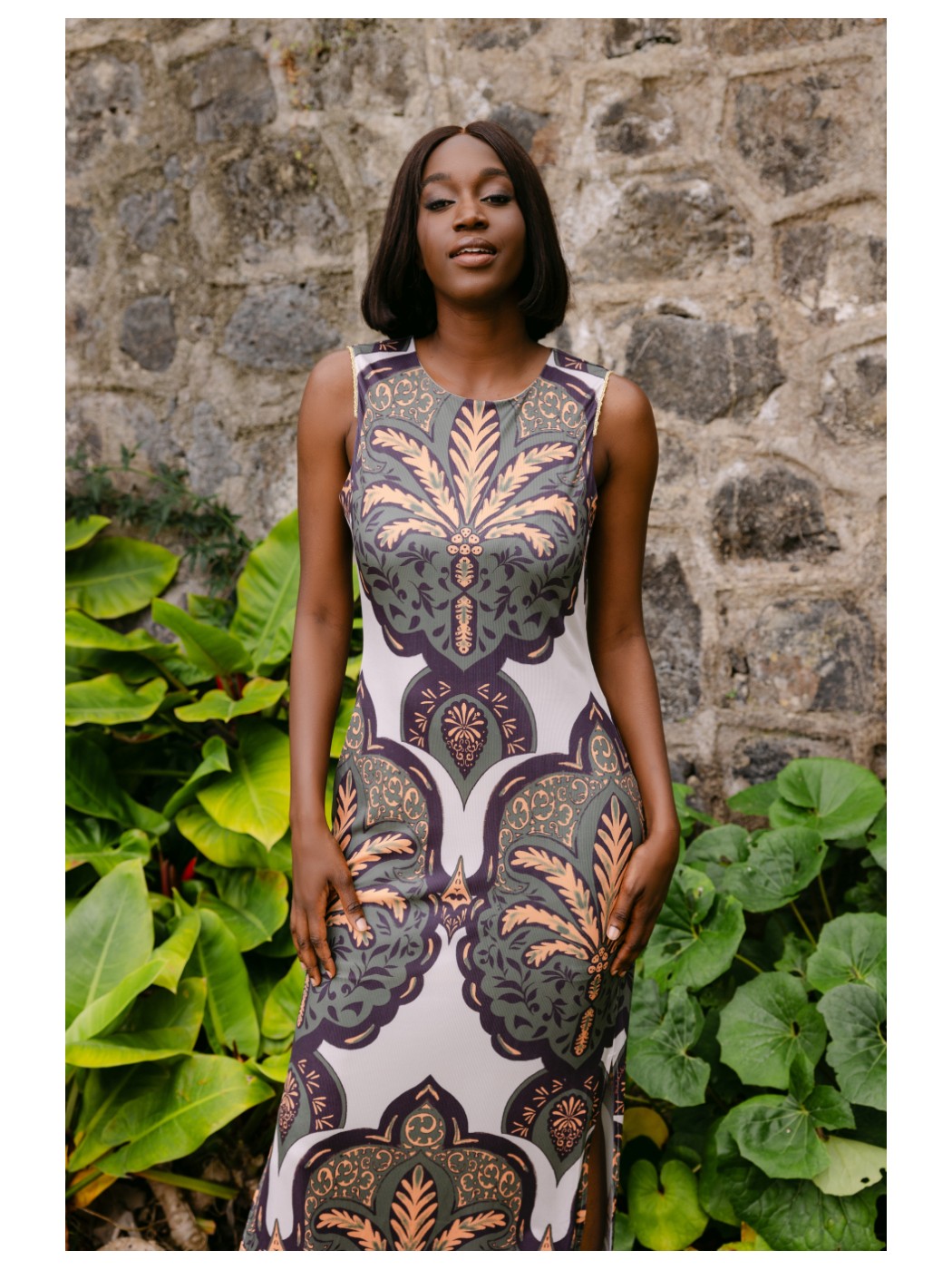 Vestido Awki Malalá. Diseño estampado. Abertura en los laterales. Tiranta con borde de bolitas al tono.