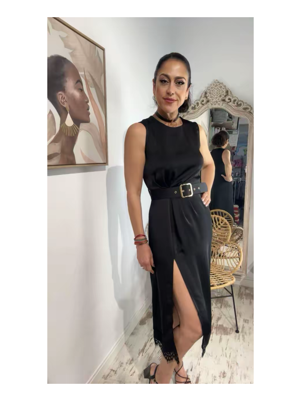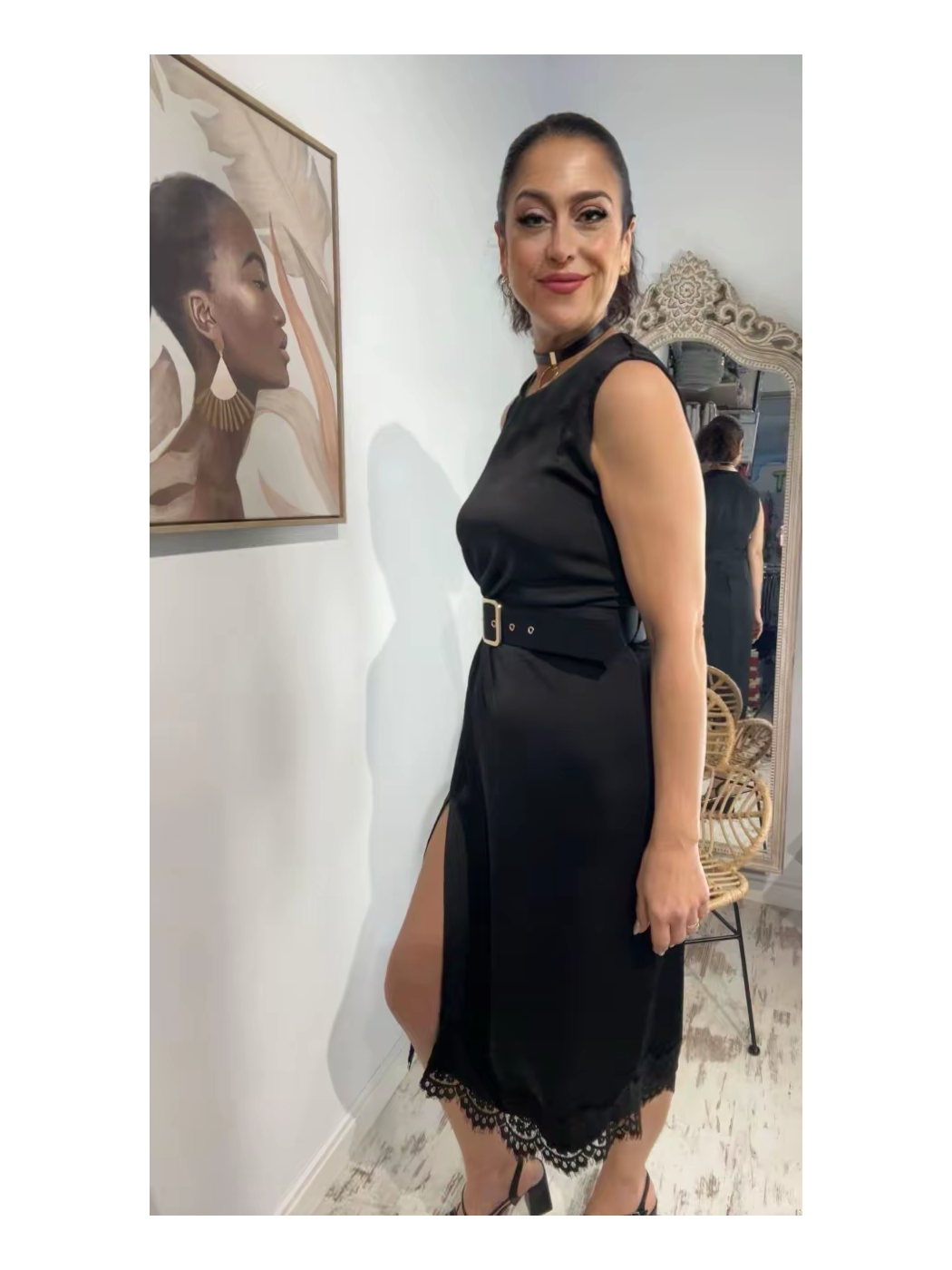Vestido Aroa encaje. Diseño con manga a la sisa. Cuenta con cremallera invisible en la espalda. Cinturón a juego con hebilla dorada. Encaje al tono en el borde bajo del vestido. Abertura en la parte frontal. Es talla única con un margen de 36 a 40.